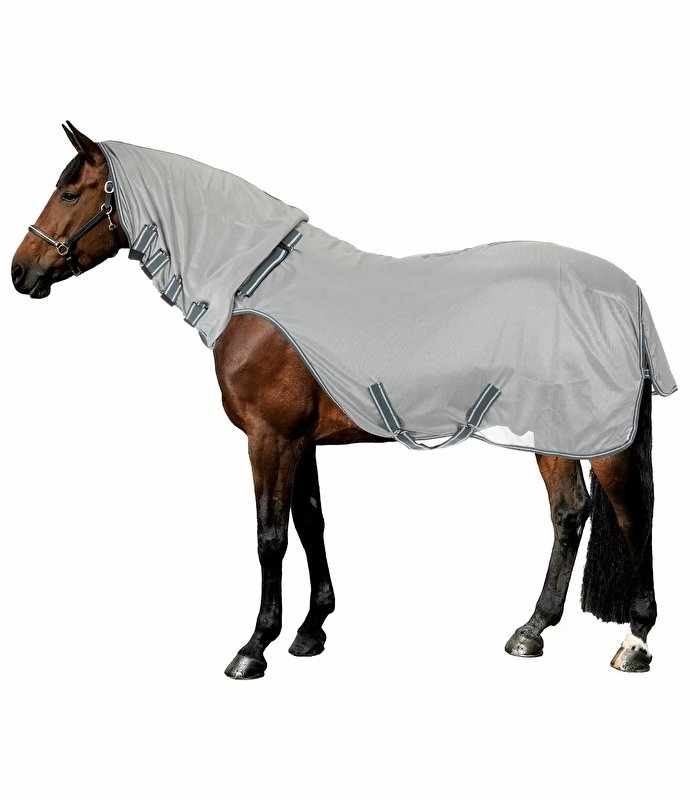 Oddychająca derka z ochroną przed muchami z mocno wszytym dekoltem i elastyczną wstawką u podstawy szyi dla optymalnej swobody ruchów. Dzięki obszernej wnęce w okolicy barków idealnie nadaje się do swobodnej pracy, karuzeli lub spacerów. Obszary szyi i ramion można indywidualnie dopasować do postury konia za pomocą bocznego regulatora KV. Część na szyję z 4-krotnym KV i elastyczną pętlą KV do przymocowania do kantara. Z krzyżowymi pasami i klasycznym zapięciem z przodu w kształcie litery T. Gładka, przyjazna dla futra wewnętrzna wyściółka w okolicy klatki piersiowej i grzywy. Obszerna klapa na ogon i regulowany pasek na ogon. 100% poliestru.