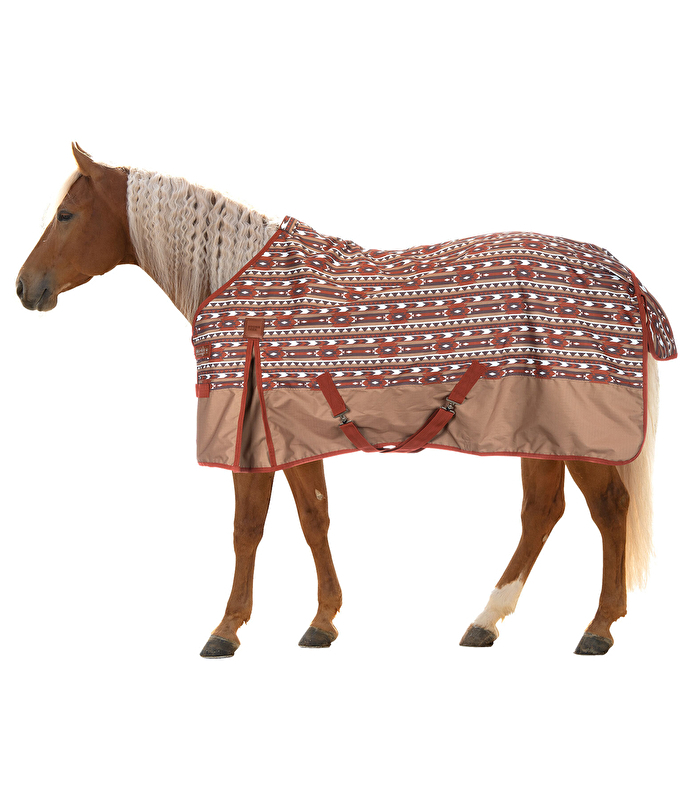 Derka przeciwdeszczowa bez wypełnienia dla koni w stylu westernowym. Wodoodporna i oddychająca (słup wody 3000 mm). Z klinem zapewniającym optymalną swobodę ruchów, zapięciem na piersi z podwójnym haczykiem w kształcie litery T z dodatkowym KV, regulowanymi krzyżami i klapą na ogon. Zawiera urządzenie do mocowania pasów na nogi ( brak pasów) i pasek na ogon z regulacją długości. Gładka, przyjazna dla futra podszewka. 600 DEN.