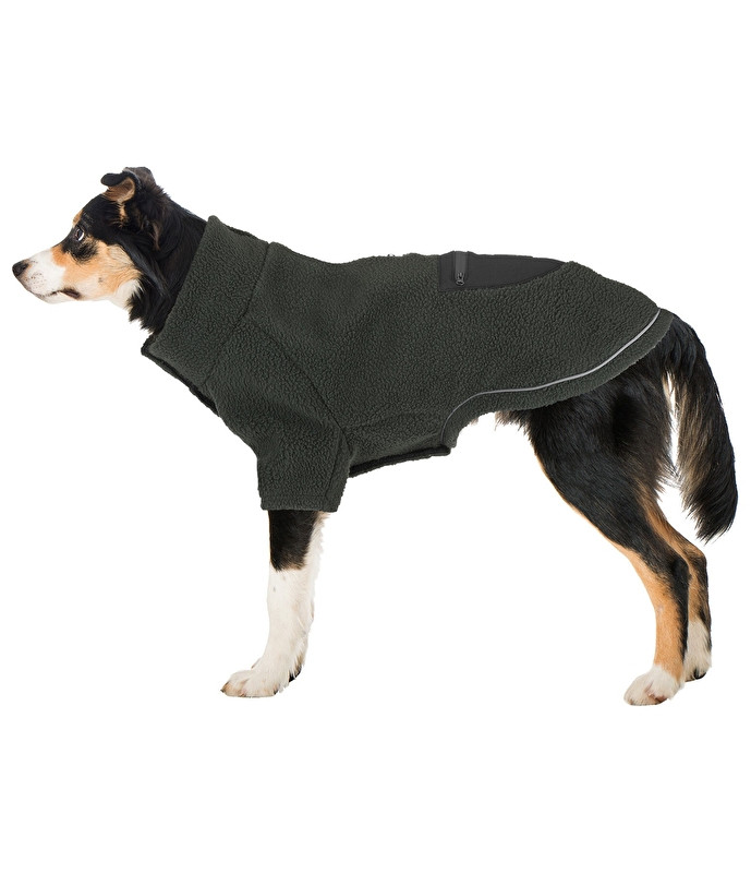 Idealna na zmienne, chłodne dni: przytulny, ciepły sweter wykonany z polaru Sherpa z powłoką hydrofobową. Hojnie wycięty, wysoki kołnierz utrzymuje szyję w cieple. Płaszcz ma modną kieszeń zapinaną na suwak, wykonaną z funkcjonalnego materiału softshell, z tyłu. Odblaskowe elementy zwiększają bezpieczeństwo po zmroku. Rozcięcie przy kołnierzu i mały, wszyty dwukierunkowy zamek błyskawiczny z tyłu umożliwiają przypięcie psa do obroży lub szelek. W zestawie znajdują się również elastyczne, ukryte paski na nogi. Dzięki podwójnemu, ciągłemu zapięciu na rzep u dołu sweterek można całkowicie rozpiąć i dopasować do tułowia psa. Oznacza to, że pies nie musi wkładać głowy przez otwór. Wystarczy położyć rozpięty sweter na grzbiecie psa, przeciągnąć dwie przednie nogi przez rękawy i na koniec zapiąć rzep. W razie konieczności przełóż tylne nogi przez paski.