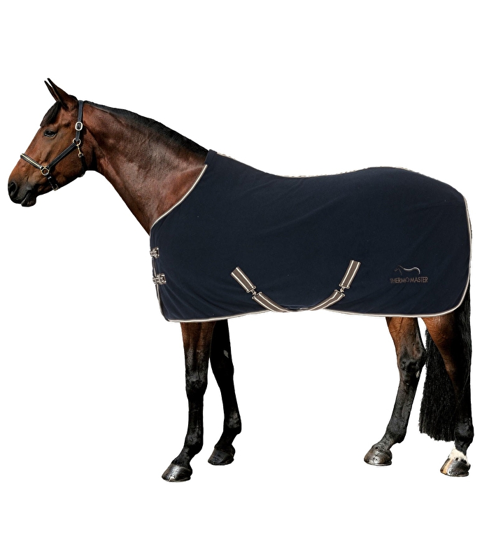 Ładnie wykończona, klasyczna derka wykonana z lekkiego polaru (230 g, antypilling). Niezawodnie odprowadza wilgoć z ciała konia. Z podwójnym zapięciem na klatkę piersiową, paskami krzyżowymi, wyściółką polarową na kłębie i sznurkiem ogonowym. 100% poliestru.