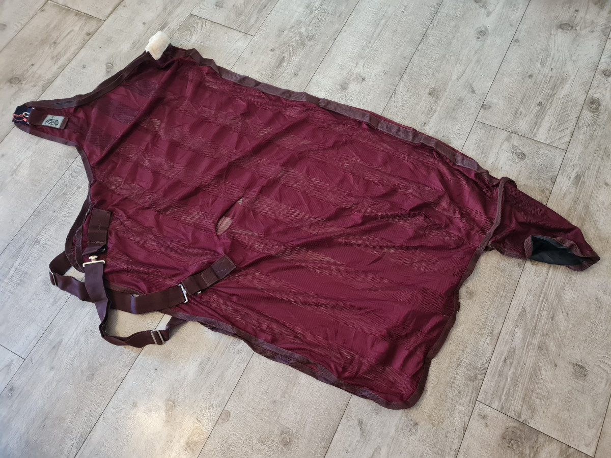 Niezwykle lekka i oddychająca derka do ćwiczeń lub do chodzenia dla koni (75 denierów) z dużym wycięciem w okolicy ramion do ochrony przed irytującymi owadami lub jako ochłoda latem, podczas transportu lub podczas relaksujących spacerów. Proste, ukryte zapięcie w kształcie litery T z dodatkowymi paskami KV i krzyżowymi zapewnia bezpieczne trzymanie. Derka posiada w okolicy barków gładką poliestrową podszewkę, która chroni konia przed otarciami. 100% poliestru.