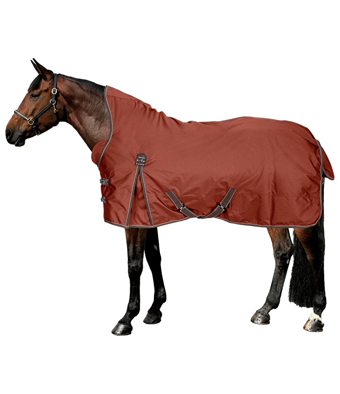 Innowacyjna derka z wysokim wycięciem pod szyją, która chroni przed przenikaniem wody i zapobiega otarciom w okolicy kłębu, a także miękkie, bocznie mocowane ochraniacze na ramiona (wewnątrz wykonane z polaru), które umożliwiają optymalne rozłożenie nacisku nawet przy opuszczonej głowie . Wykonana z oddychającego i wodoodpornego materiału ripstop 600 denier (słup wody 3000 mm, oddychalność 3000 g / m2 / 24h) z subtelnym tłoczeniem znaku wodnego. Podwójne, regulowane zapięcie z przodu na D-ringi i karabińczyki oraz dodatkowe KV i regulowane pasy krzyżowe. Zawiera urządzenie do opcjonalnego mocowania linek na nogi, regulowany pasek na ogon i klapkę ogonową. 100% poliestru.