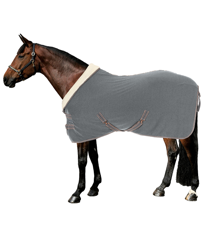 Przytulna, pochłaniająca wilgoć derka polarowa z szerokim kołnierzem z polaru pluszowego. Gładka, przyjazna dla futra wewnętrzna wyściółka w okolicy klatki piersiowej i łopatek. Wyposażony w podwójne zapięcie na piersi w kształcie litery T, poprzeczne pasy i regulowany pasek na ogon. Pasujące do kolekcji: brzegi, lamówka i tył z wplecionej przędzy brokatowej. 100% poliestru.