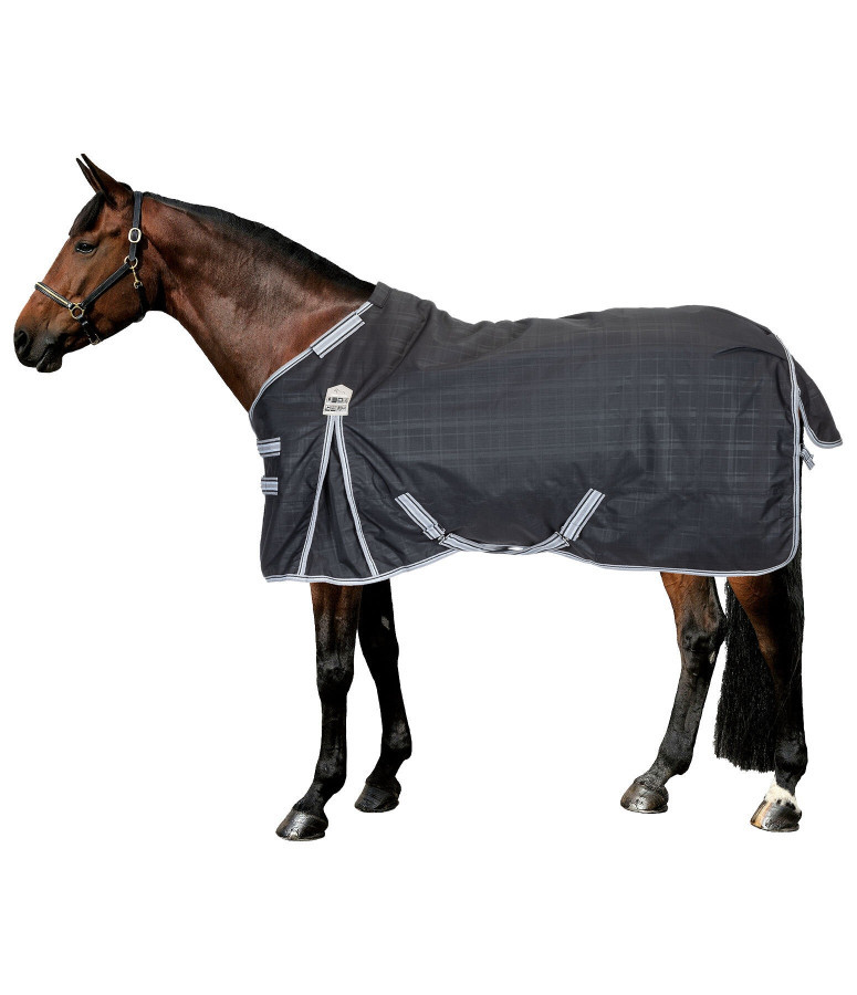 klasyk, teraz dostępny w edycji specjalnej, z odpinanym kołnierzem w eleganckiej czerni z subtelnym, niezwykle stylowym, wytłoczonym wzorem w kratkę. Wodoodporna i oddychająca derka przeciwdeszczowa wykonana z materiału ripstop o grubości 600 denierów (3000 mm słupa wody), która zapewnia Twojemu koniowi niezawodną ochronę przed wiatrem, zimnem i deszczem, a także może być używana elastycznie z kołnierzem lub bez. Posiada klin dla optymalnej swobody ruchów, podwójne zapięcie na klatce piersiowej w kształcie litery T z dodatkową osłoną podbródka, regulowane pasy krzyżowe i klapę na ogon. Nie posiada wypełnienia. W zestawie pasek na nogę oraz regulowany pasek podogonowy. Gładka, przyjazna dla sierści podszewka gwarantuje lśniącą sierść i nie niszczy się. 100% poliester.