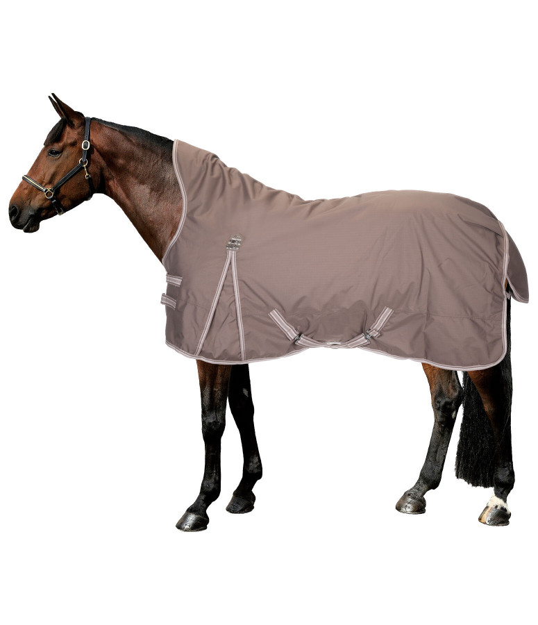 Funkcjonalny, wodoodporny i oddychający materiał derki przeciwdeszczowej z wysokim kołnierzem wykonany z ripstop 600 denier (słup wody 3000 mm, oddychalność 3000 g / m2 / 24 h). Nowoczesny krój z wysokim kołnierzem zapobiega przedostawaniu się wody w okolice ramion i zapewnia niezawodną ochronę, zwłaszcza podczas ulewnego deszczu. Wysoka szyja zapobiega również niepotrzebnemu uciskaniu w okolicy kłębu. Z klinem zapewniającym optymalną swobodę ruchów, zapięcie na klatkę piersiową z podwójnym haczykiem T z dodatkowym KV, regulowanymi paskami krzyżowymi i klapą ogonową. Zawiera Urządzenie do mocowania sznurków udowych i paska na ogon z regulacją długości. Gładka, przyjazna dla futra podszewka. 100% poliester.