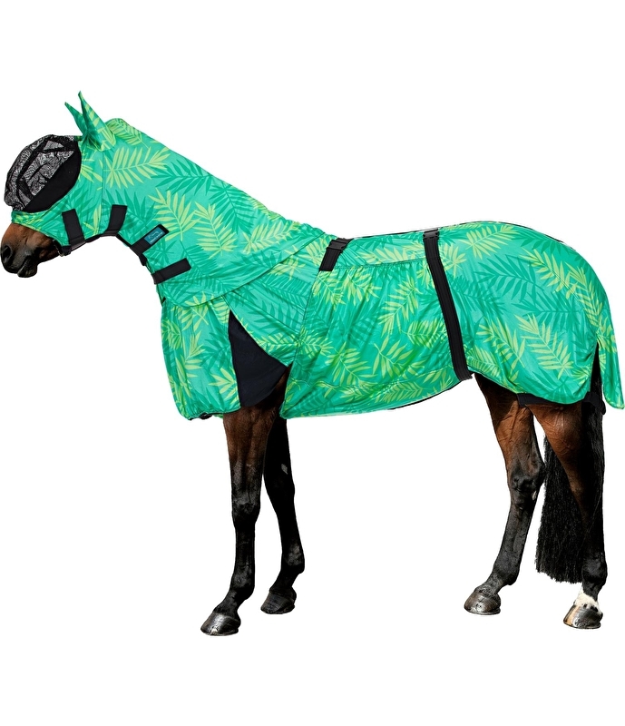 Derka przeciw owadom - egzemowa, wykonana ze specjalnego, oddychającego funkcjonalnego materiału z włókien w letnim stylu z subtelnym nadrukiem. Zapobiega nadmiernemu poceniu się i szybko wysycha. Odporna na promieniowanie UV. Ma doskonałe dopasowanie, które zapewnia nieograniczoną swobodę ruchów. Z dużą osłoną ogona i odpinaną klapą pod brzuchem. Maska z przedłużeniem zapewnia dodatkową ochronę i jest w razie potrzeby mocowany do derki. 100% poliester (włókno funkcjonalne).