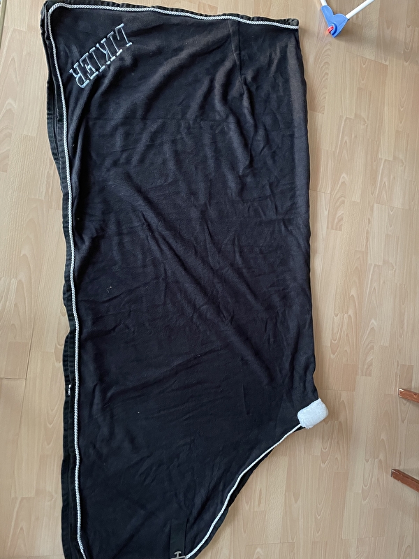 Derka czarna polarowa firmy BM Horse, z białym futerkiem na kłębie i srebrnym połyskującym sznurem. Po jednej stronie ma logo BM Horse po drugiej napis LIKIER.