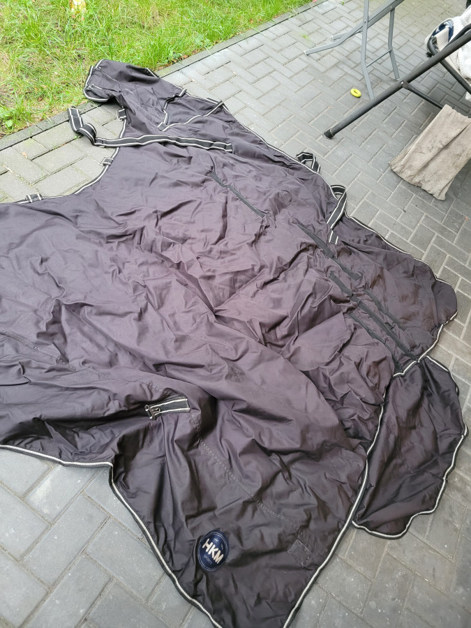 Czarna, też nie znam dokładnej gramatury ale jest grubsza niż granatowa, myślę że ma 150/200g. Rozmiar 155cm. Stan dobry, uszkodzenia naprawione. 150 zł