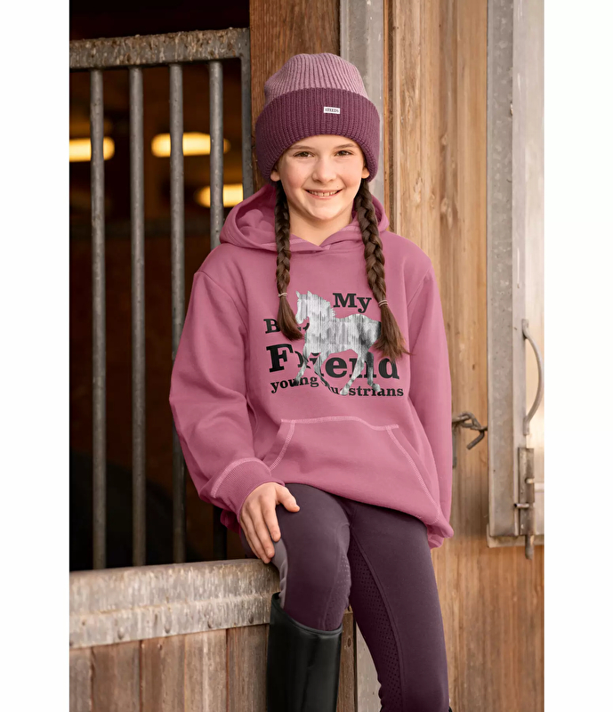 Modna bluza dziecięca z przyciągającym wzrok mottem, nadrukiem konia i zintegrowaną kieszenią typu kangur z przodu. Szwy w kontrastowych kolorach, przytulne wnętrze, mankiety i talia wykonane z delikatnego prążkowanego materiału. 60% bawełna, 40% poliester.