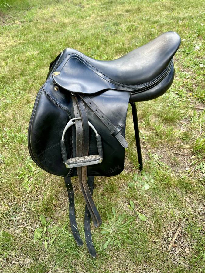 Rozmiar siedziska 17,5, płaskie siedzisko, tylny łęk kwadratowy, klocki kolanowe z możliwą regulacją na rzepach. Przystuły były zmieniane pod popręg ujeżdżeniowy. Siodło regularnie czyszczone i smarowane, stan dobry. Rozmiar łęku 32-33
