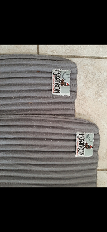Oryginalne podkładki pod bandaże firmy Eskadron. Zapewniają optymalną cyrkulację powietrza i przez to są idealnymi podkładkami treningowymi. Nadają się również do opatrunków medycznych. Rozmiar 45x40 cm. Kolor jasny popiel. Komplet na dwie nogi. Jedna z owijek jest trochę zmęczona, chodzi o brzeg