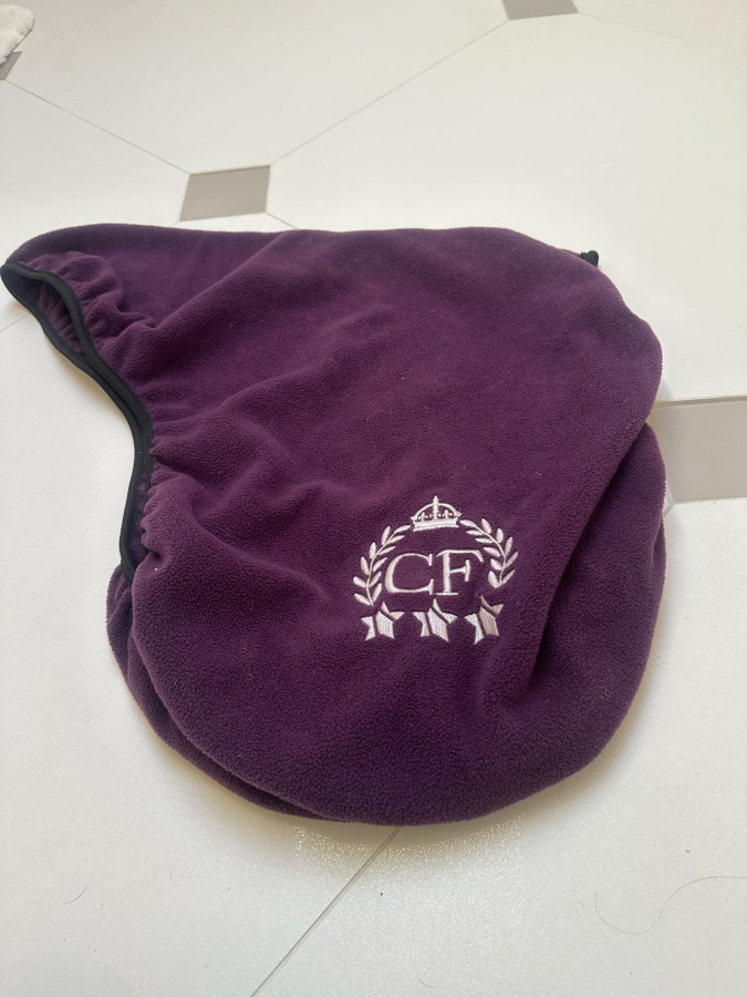 Sprzedam, fioletowy, polarowy, pokrowiec na siodło marki CF. Będzie pasował na siodła ujeżdżeniowe. Stan widoczny jest na zdjęciach (posiada brudne ślady, które powinny zejść w praniu, puścił szew na małym odcinku przy gumie, guma jest nieco rozciągnięta, ale trzyma). Cena 20 zł.