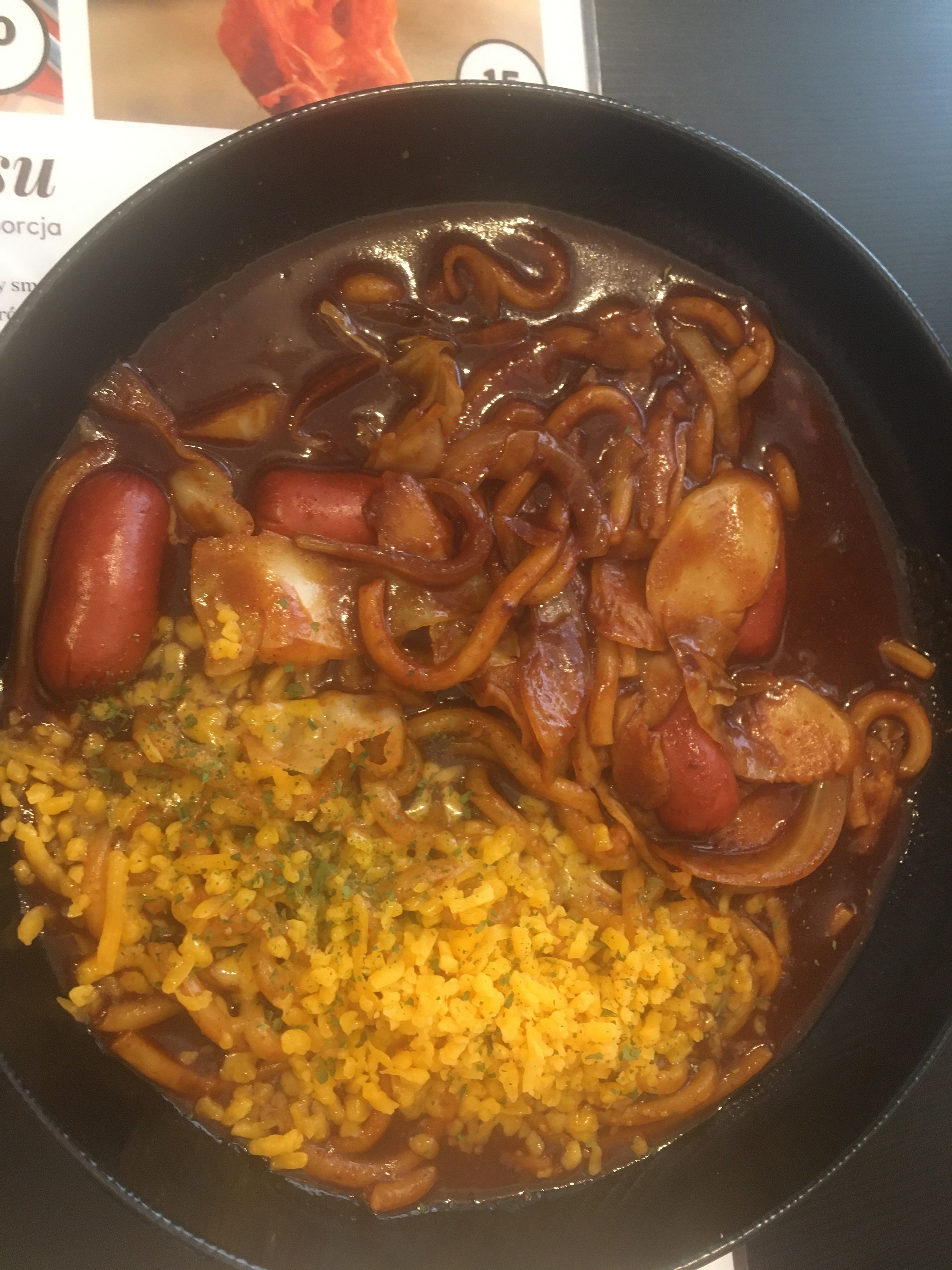 Bardzo smaczne jedzenie. Spróbowałam pierożków z mięsem, kimbap, Black ddeokbokki (bardzo ostre) i rose tteokbokki (ostre, ale przy tym pysznie serowe z ryżowymi kluchami).
