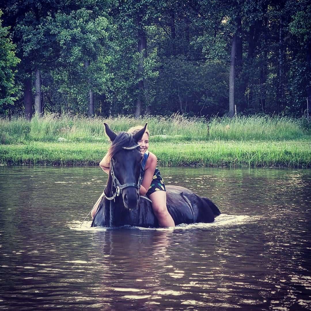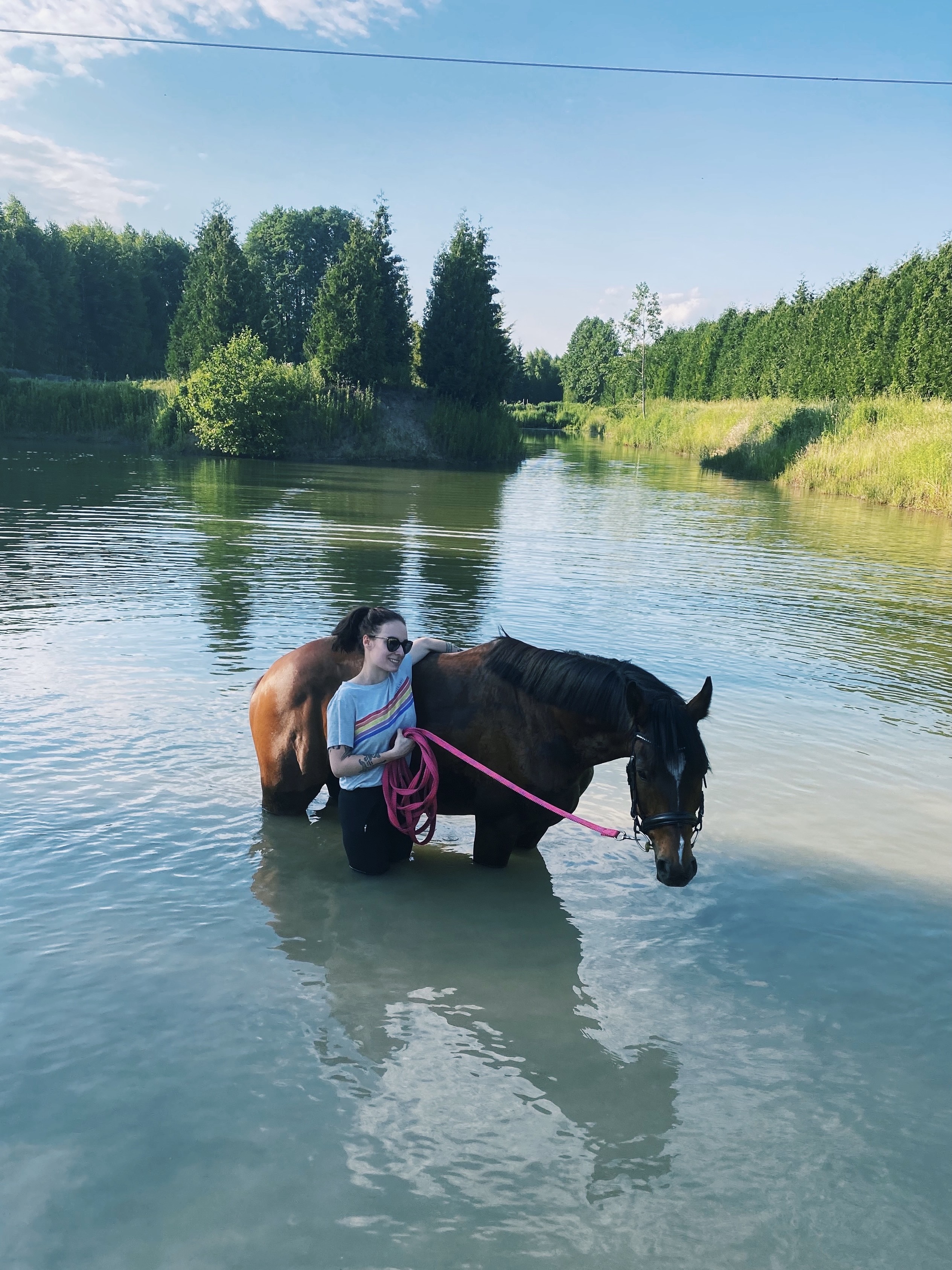 No my jeszcze nie próbowaliśmy z siodła/na oklep, tylko w ręku właśnie. Ja wchodziłam pierwsza i pokazywałam, że woda jest spoko 😉 Popatrzył chwilę, powąchał i zlazł za mną, nawet bez marchewki.