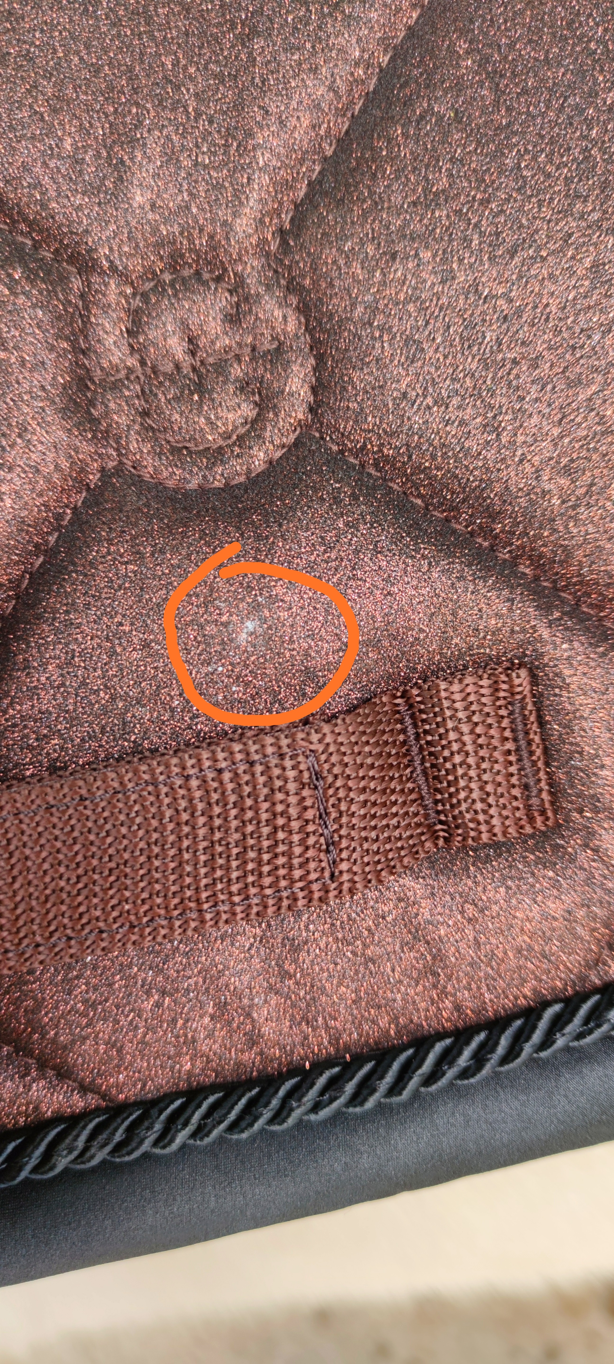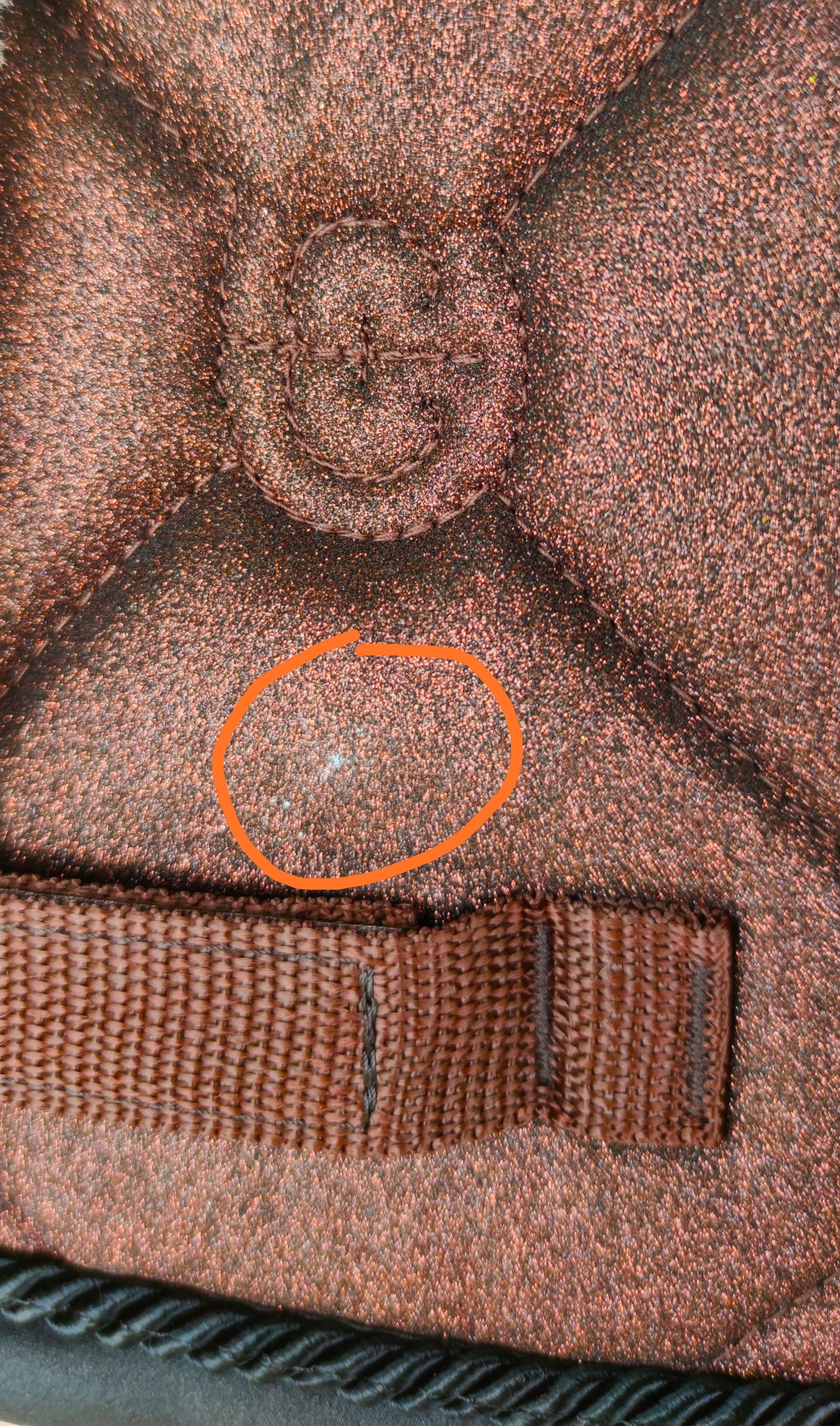 feno, akurat wypada pod popręgiem, nie będzie nic widać, a to i tak newralgiczne miejsce gdzie czapraki najszybciej się niszczą. Dla mnie wada do przełknięcia. Inna sprawa, że szkoda mi używać mahogany właśnie z obawy przez wycieraniem brokatu 😅 i czekam na opinie osób które już trochę go pociurają.