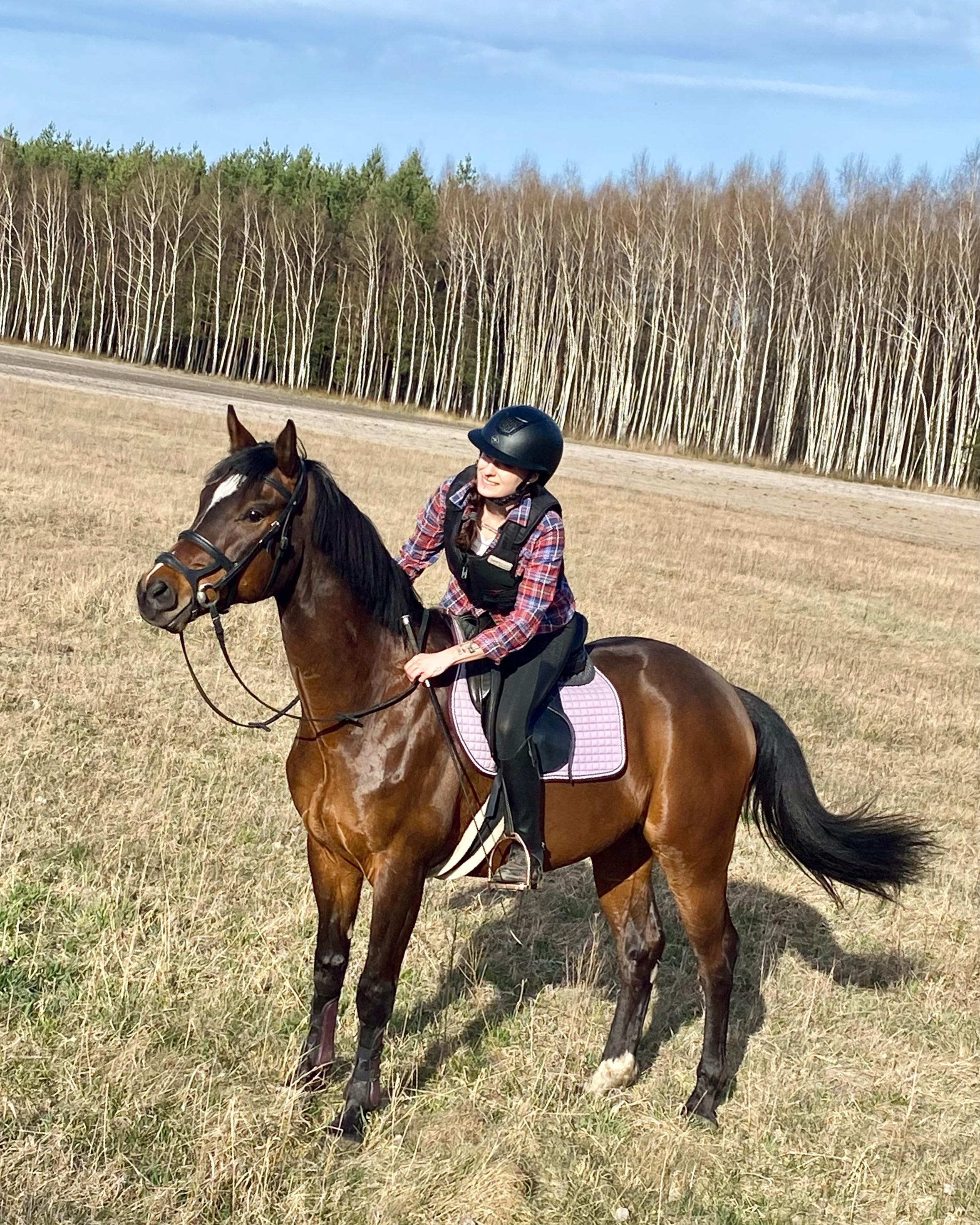 My jak już wracaliśmy do lepszej formy po pękniętym nosie to Syn był 4 dni w klinice, teraz mi trener wyjechał, więc się w sumie bujamy na luzie na lonży. No i teraz jestem codziennie rano dać leki, to chodzi sobie na karuzelę. Dopiero po majówce wrócimy do regularnych treningów. Ale w końcu mam konia zdiagnozowane plus była osteopatka i powiedziała, że jest „mięciutki jak kaczuszka” i nie ma co z nim robić, także w końcu mam pełny luz psychiczny i mogę zacząć od niego wymagać, zamiast się zastanawiać, czy go coś nie boli. Także nie mogę się doczekać, bo czuję, że teraz w końcu porządnie do przodu ruszymy.😁