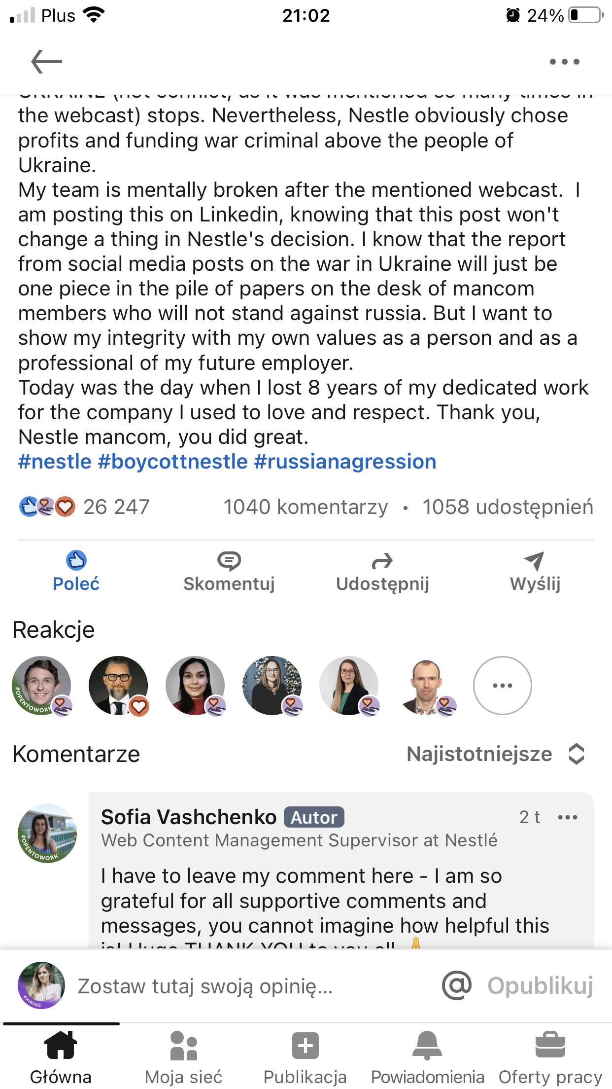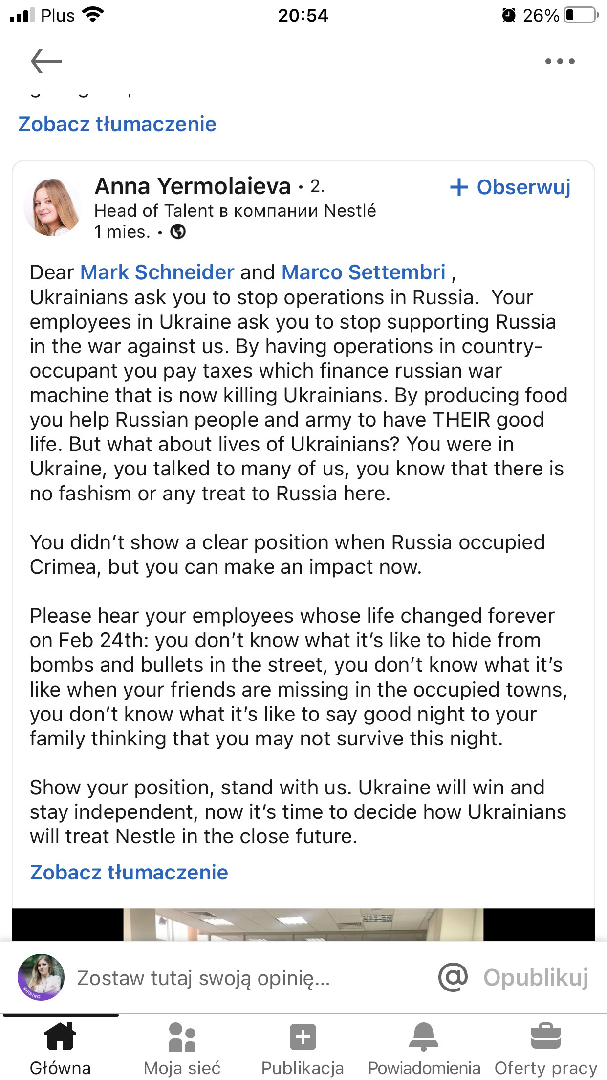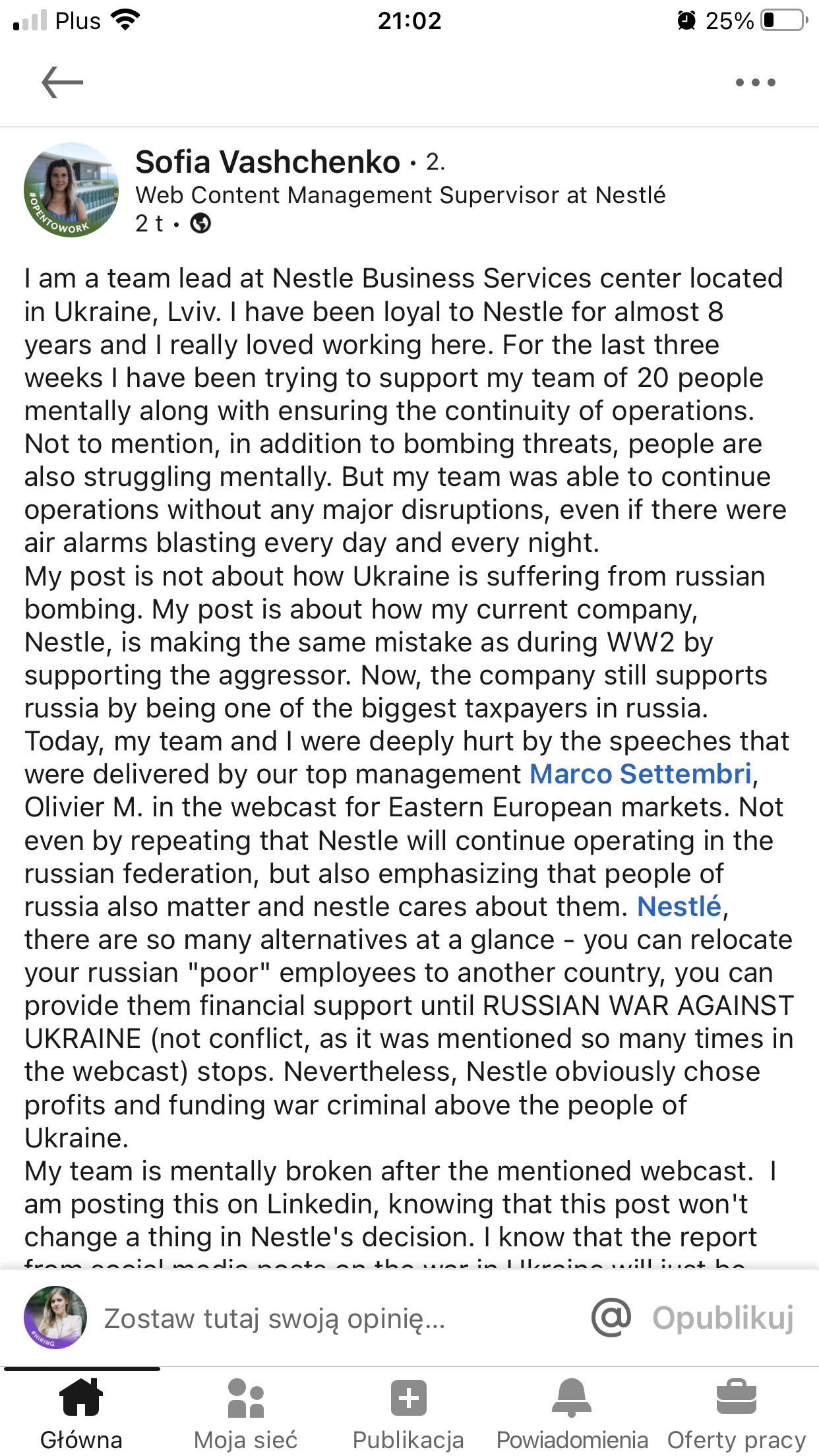 Nie rozumiem tego bojkotu, przecież ludzie w Rosji tez muszą jeść. Moja firma się nie wycofała, to mam się zwolnić z pracy w ramach protestu czy jak? Mam pójść do dyrektor i powiedzieć „wycofajcie się z Rosji bo mi się to nie podoba”? To nie jest decyzja jednej osoby ani tym bardziej nie jest to decyzja szeregowych pracowników.