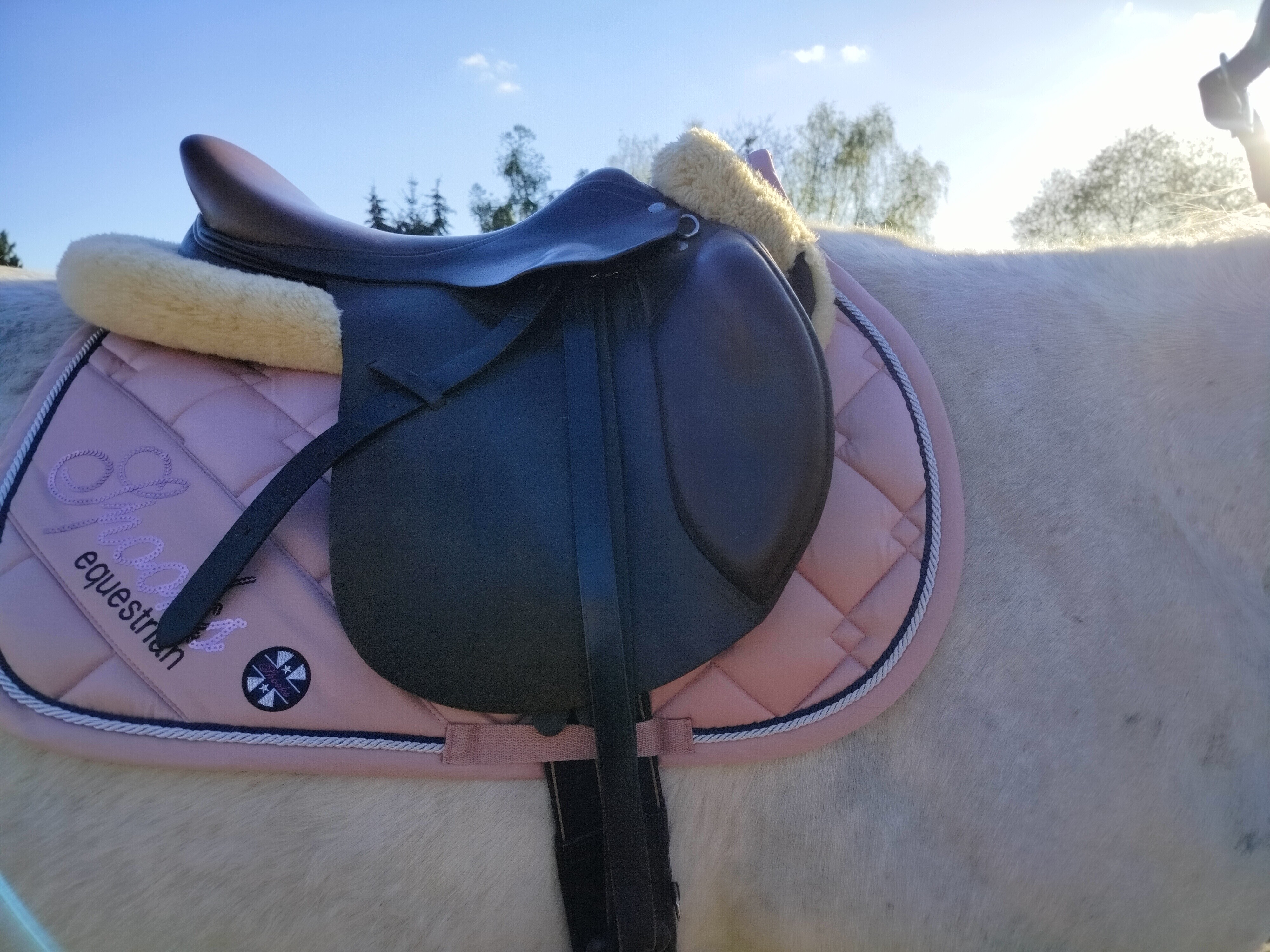 Mój absolutnie nawzdymany trawą koń w PSoS Blue Horizon. Niestety przy odrobinie potu „przeciekł” i zacieki zostały, więc pare lekkich użyć i do pralki. Wolałabym też, żeby paski od popręgu były przyszyte ciut bliżej przodu czapraka, żeby nie było go aż tak dużo z przodu, ale to już moje preferencje.