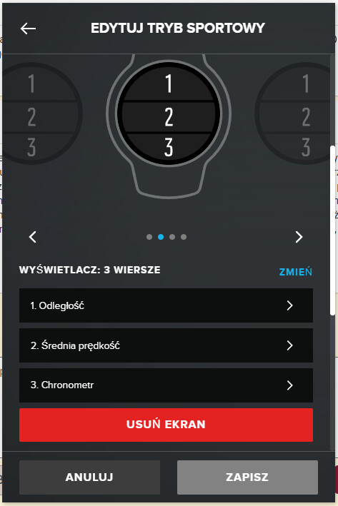 Nie dodam screenów w edycji, więc post pod postem. Tak sobie ustawiasz ekrany do ćwiczeń, trzy dane na ekran. Trochę tego jest do wyboru. Ten mój zegarek to już jest antyk, przyciski ciężko chodzą już, ale działa nadal. I go nie żal do stajni. 😂