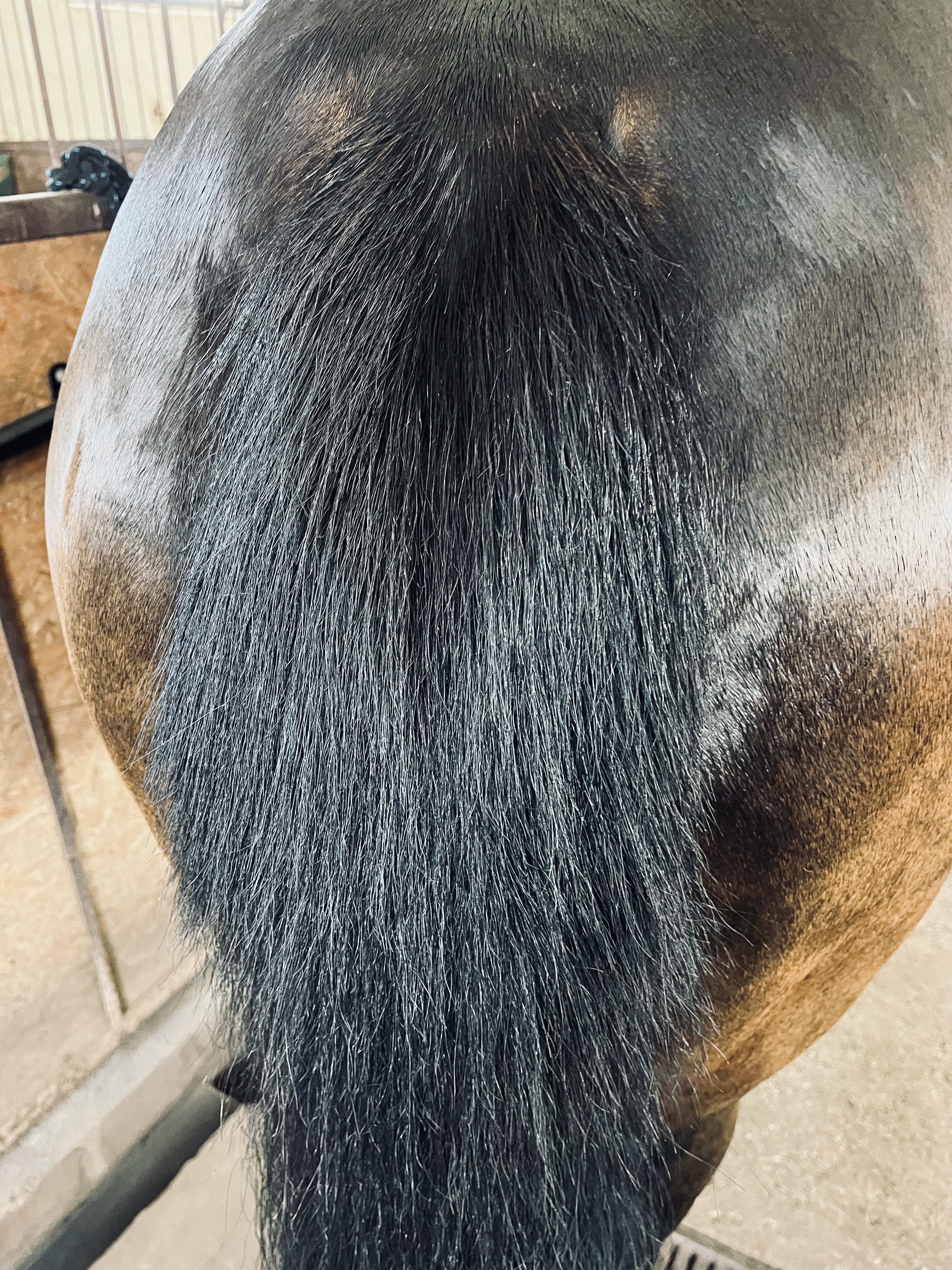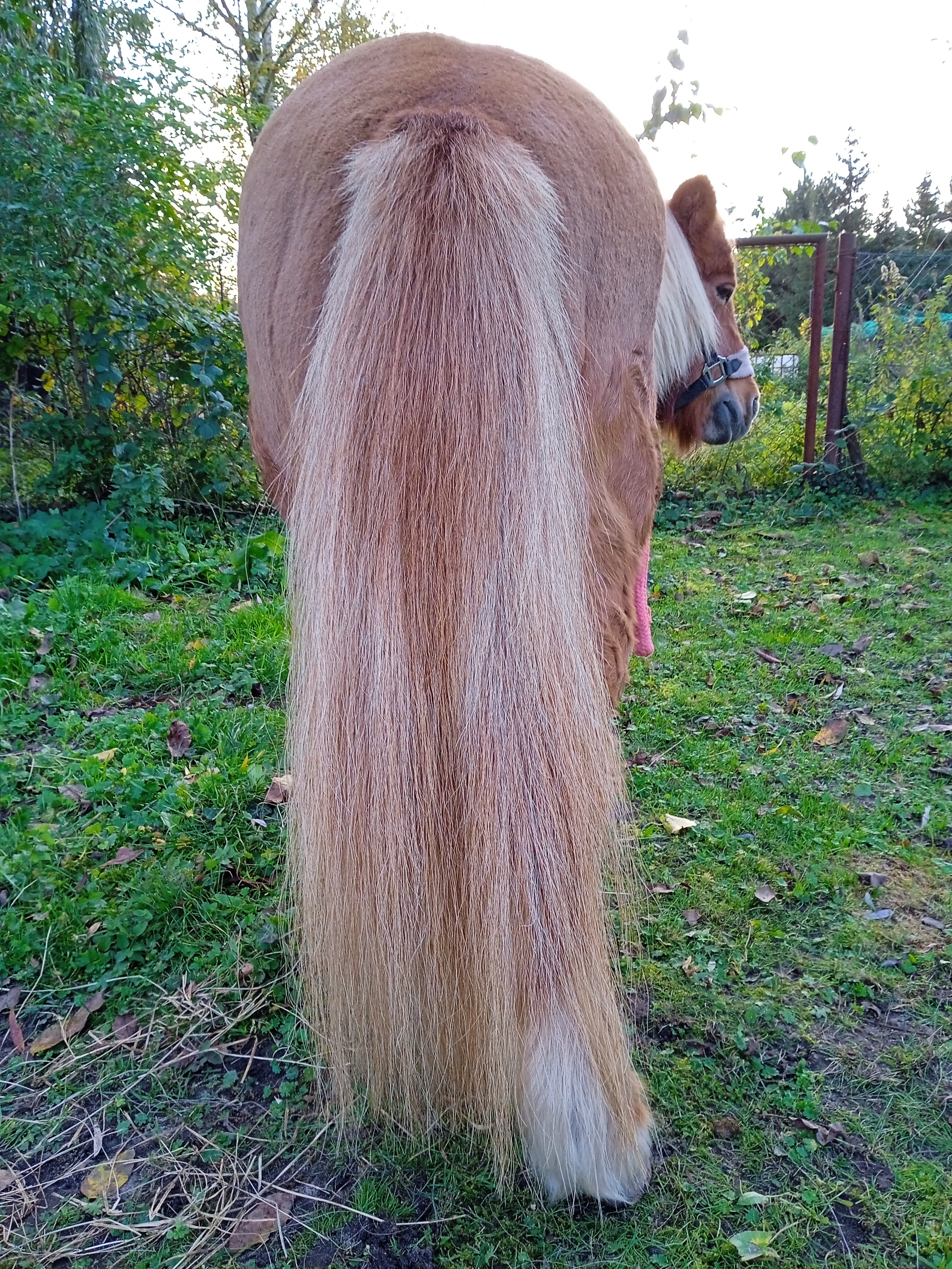 Koń sobie w zeszłym roku elegancko pół ogona wytarł, bo pogryzły go muchy w puzdro i się drapał. Widać to na zdjęciu, że od rzepa idąc ogon powinien być 2 razy taki jak jest.