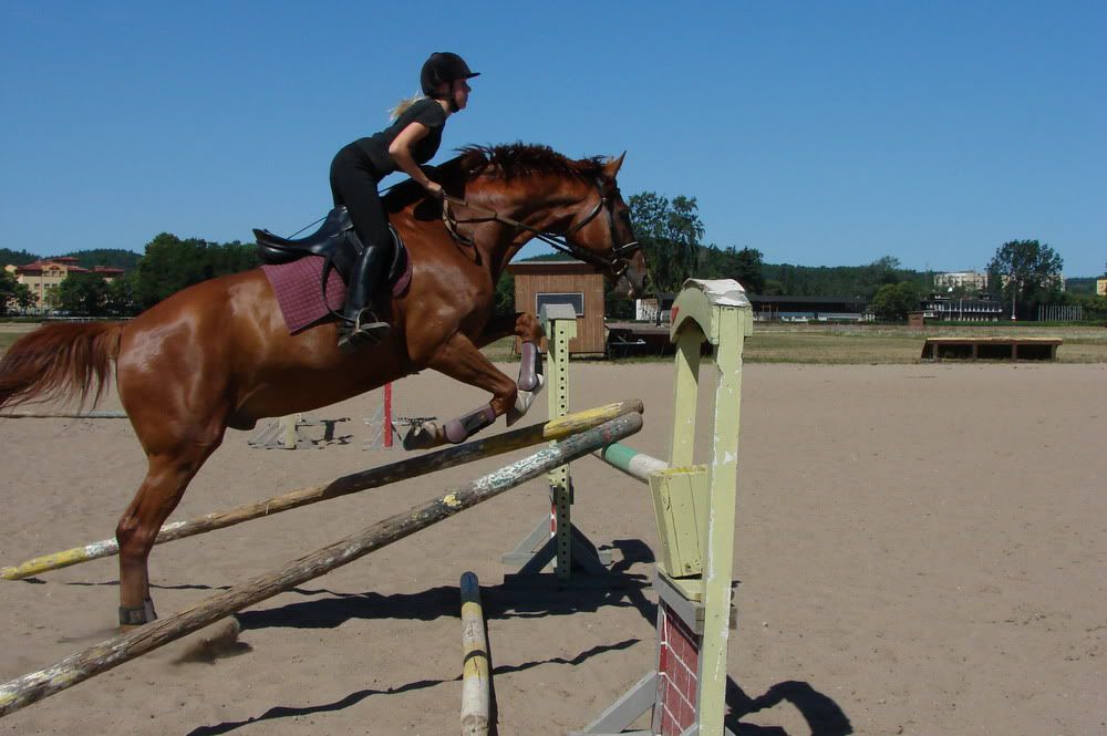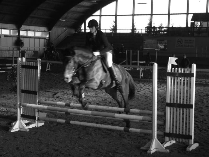 noen, pierwsze w porządku, drugie - jakbyś 150 skakała 😉 Obniż się w biodrach, nie "wychodź" tak wysoko 😉 Trzy- o ile na drugim jesteś w miarę rozluźniona, tak tu w ogóle. Rozluźnij kolano, noga Ci uciekła do tyłu 😉 I znów za duży półsiad. Ręka też jakby spięta. Pozdrawiam 😉