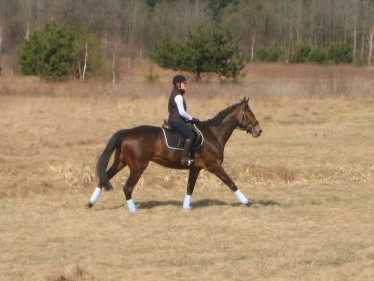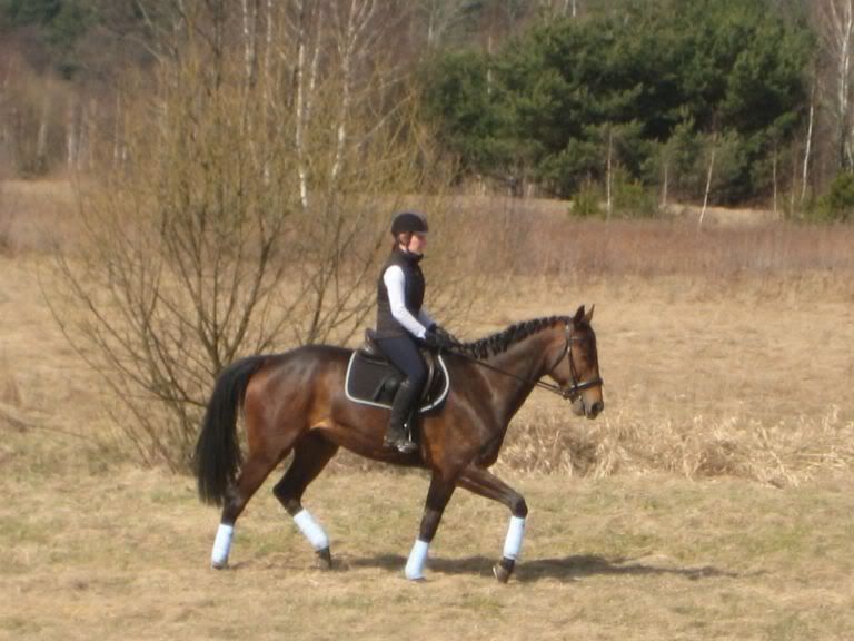 ale też się zaciskam łydkami i odjeżdżam do tyłu - w sumie jak sie pilnuję to potrafię to wyelimimować, ale może na 5 min... i jak jade ją bardziej w dole, to jeszcze jakoś siedzę w miarę, ale jak wezmę ją wyżej, jak na zdjęciach i próbuje cos ćwiczyć to zapominam całkowicie o dosiadzie - a przecieć bez tego nie wyjdą mi poprawne ćwiczenia - zakmnięte koło... dzisiaj w sumie była baaardzo senna i leniwa, może się troche zapchała trawą młodą, widac chyba zresztą że taka bez zycia jest na zdjeciach - normalnie jest inna, bardziej do przodu, z błyskiem w oku 😉 - no ale i tak nie powinno to byc wytłumaczenie dla mojego dosiadu przecież, że koń miał lenia...poza tym niezależnie od jej nastroju ja siedzę fatalnie.