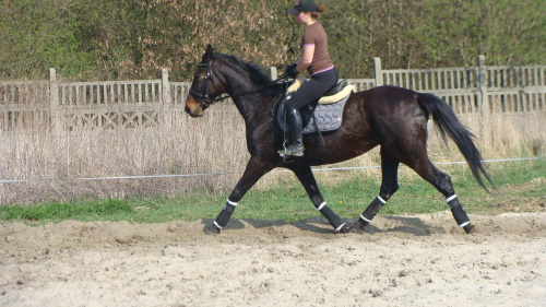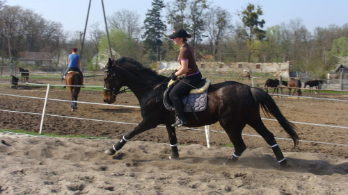 koń od lutego powoli wdrażany do pracy po długiej przerwie nic nie robienia. Ponieważ był wychudzony i bez mięśni najpierw został odkarmiony, a potem pracował na lonży i w terenie. Od około półtora miesiąca pracujemy na placu. Pracę na placu przeplatamy lonżowaniem + tereny na wzniesieniach, jeden dzień ma wolny.