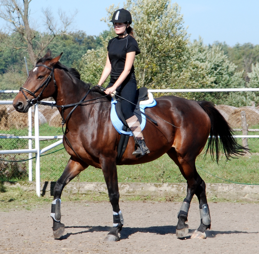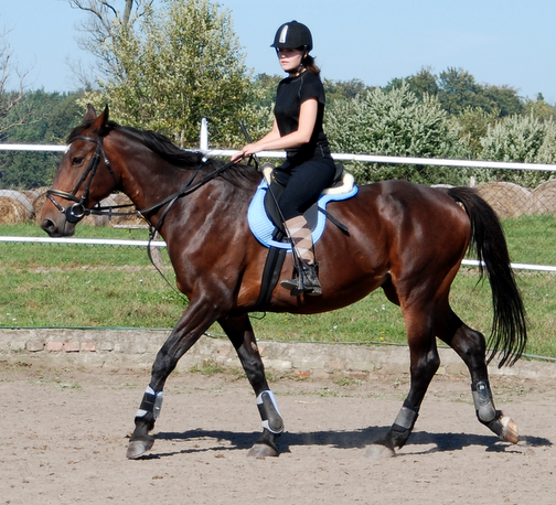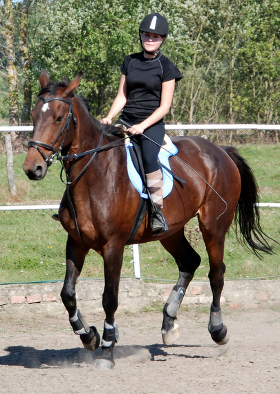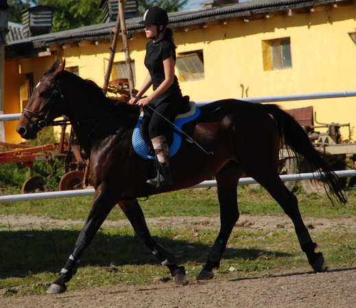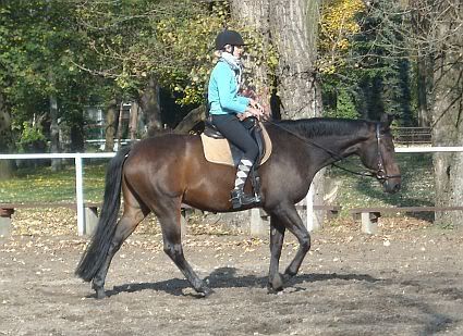A co do jakości chodów... To ostatnie miesiace jeżdżę takiego gagatka, który kłus przypominający start promu kosmicznego, który bardzo ciężko jest wysiedzieć, jeśli ów gagatek nie jest na jakimkolwiek kontakcie. Za to galop - baja. Obszerny, od zadu, energiczny. I o wiele łatwiej jest mi go przepychać obok 'strasznych' wózków, zakrętów w galopie, niż w kłusie, gdzie zanim 'dolecę' anglezując, do siodła to już konia nie mam pod tyłkiem, bo zawinął. ;-P