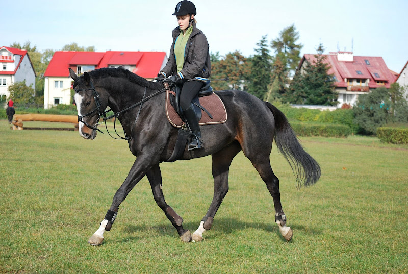 Mnie się też wysokość ręki podoba, za to mniej mi się podoba to, że się Strzyga patrzy na konia i przez to się pochyla/kuli ramiona. Poza tym przypominam o takiej drobnej zasadzie - nakrycie wierzchnie albo rozpinamy pod szyją, albo zdejmujemy. Jeżdżenie w takiej rozchełstanej kurtce jest po pierwsze nieeleganckie, po drugie utrudnia ocenę sylwetki jeźdźca. Na zbliżeniu rzuciło mi się jeszcze w oczy, że łydka uciekła na bok, kolano zostało wparte w siodło. Spróbuj wstając obciążać bardziej strzemię tak, żeby pięta szła na dół, a łydka zostawała przyłożona, nie odlatywała na bok 😉 Poza tym bardzo przyjemny obrazek 😀