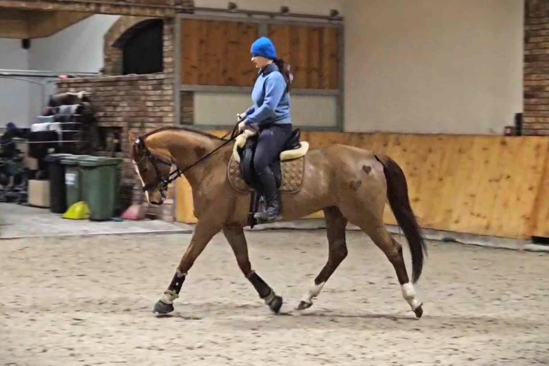 Wrzucam zdjęcie z testów (nie mam za bardzo aktualnych), gdzie wsiadłam na chwilę, by tylko sprawdzić siedzisko (bo właśnie chciałam o 0,5 rozmiaru większe, bo w 17 siedziało mi się dziwnie, a taką mam skokówkę), bo kobyła pokazała, że no to siodło nie jest dobrane pod nią, więc było to tylko 5 minut by poczuć. Teraz mam jeszcze dłuższe strzemię, a na zdjęciu jadę anglezowanym asekuracyjnie, ale no widać, gdzie ta noga wypada.