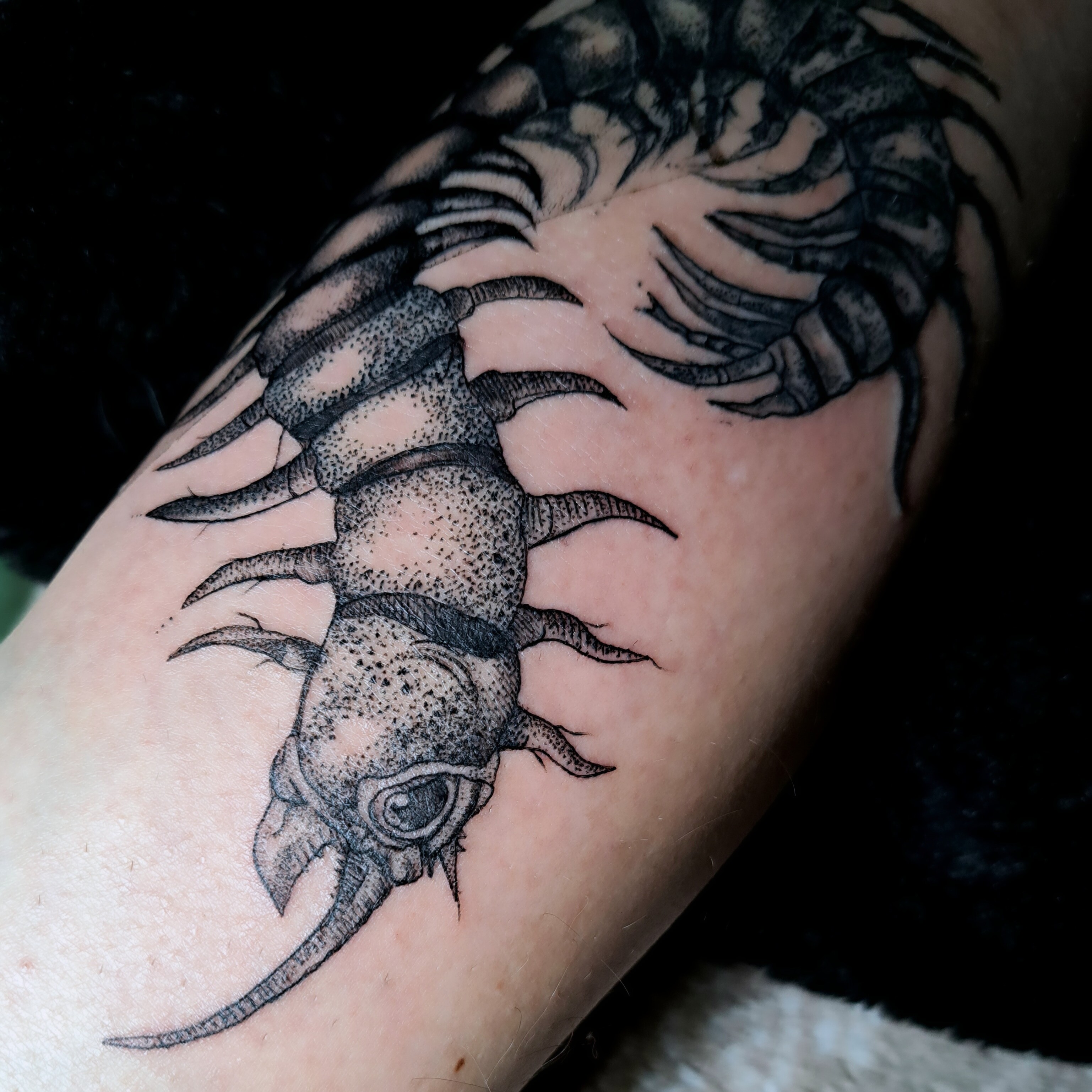 Swoja drogą mój mąż dorobił się tego. Robiłam to w 4 sesjach. Dupke robaka zrobiłam jak nie miałam pojecia co robie. Słabo mi szło, tusz sie nie wbijał, nie ogarniałam tematu, wiec zostawiłam to na jakies ponad 2 miesiace. No lepiej mieć tylko dupke zjebaną i do poprawy , niż całość. Reszta robiona w 3 sesjach... bo wiecie, jak płacicie 3tys za sesje całodzienną, to choćby skały srały to wytrzymacie. A jak żona robi, to można jęczeć, narzekać i zrezygnować po 1,5h. Część tego robaka jest zaklejona, bo była robiona dzień wcześniej.