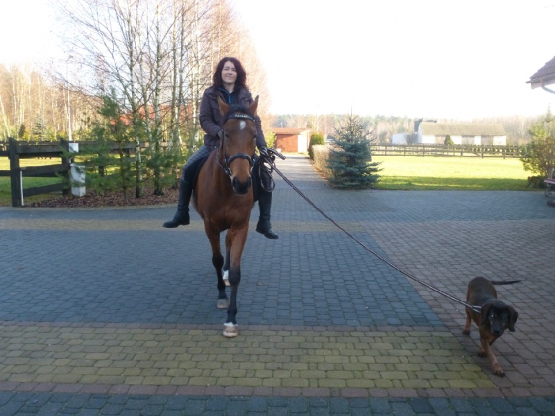 Psy w terenie są bardzo nawet przydatne, dzierżawiłam klacz w stajni w Małopolsce (ale to nie ważne). Przed jazdą, postanowiłam z koleżanką wybrać się na rozstępowanie do lasu, ( była tam ścieżka, raz nią jechałyśmy i pamiętałyśmy mniej więcej drogę, poza tym była prosta, więc myślałyśmy,że nie ma szansy się zgubić) W teren poszły z nami 3 bardzo dobrze wyszkolone border collie, trzymały się nas , odchodziły kawałeczek, ale po zawołaniu wracały. Do póki nie spotkaliśmy po drodze sarny. Nim się obejrzałyśmy psów nie było. Wołamy wołamy, ale nie przychodzą, nagle z za krzaków wyskoczyły 2 ( oczywiście konie się wystraszyły,ale wszystko do opanowania). Ale jeden nie przyszedł, zaczęłyśmy go szukać, weszłyśmy w głąb lasu, zeszłyśmy ze ścieżki ( oczywiście się zgubiłyśmy), po około 25 minutach znalazłyśmy psa bawiącego się patykiem, eh. Nie wiedziałyśmy jak wrócić, ale na nasze szczęście psy znały doskonale okolice i zaprowadziły nas z powrotem do stajni. Mam taką nauczkę teraz,że nie ważne jak dobrze wyszkolone byłyby psy, to będę je brać na lonży w teren tak jak tunrida zrobiła.