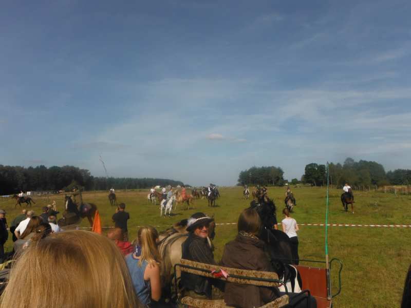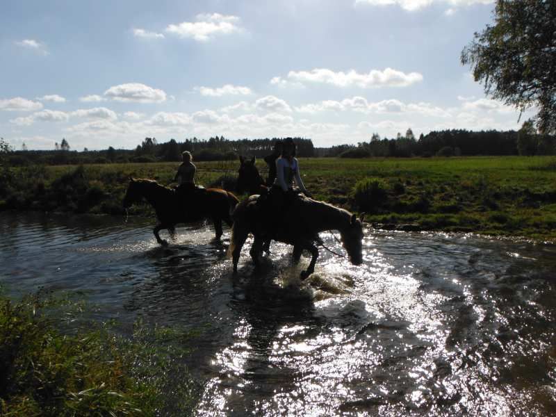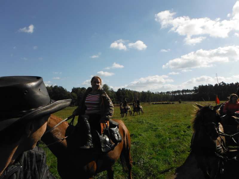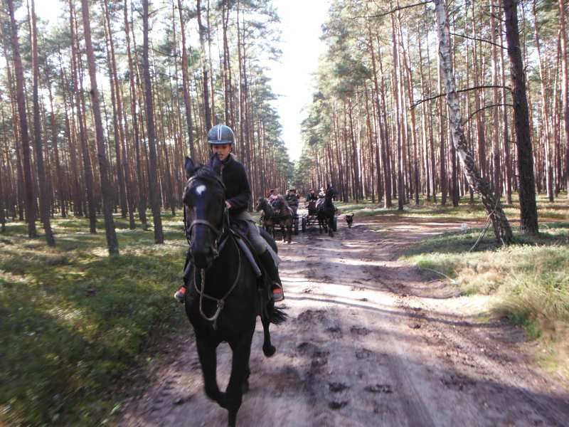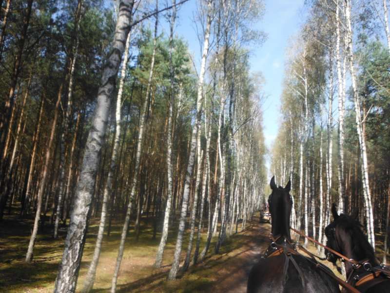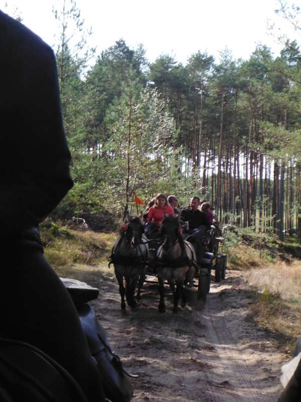 Nas wyjechało ze stajni jedna bryczka i 3 konie 😉 ale po drodze ciągle się ktoś dołączał 🙂 Najdłuższy odcinek przejechaliśmy w 3 bryczki i 7 koni. A ostatniego dnia, jak już jechaliśmy na Hubertusa to było jakieś 11 koni i 12 bryczek, ale nawet nie jestem się w stanie doliczyć 😉 Wyjechaliśmy z okolic Milicza (dolnośląskie), dojechaliśmy do okolic Ostrowa Wielkopolskiego (wielkopolska). Widoki cudowne, pogoda prawie cały czas doskonała 😉 (pierwszy dzień lało i było zimno) Julka, najmłodsza 11 letnia dziewczynka, jechała na najwyższym i największym koniu 🙂 I dawała radę 😉 Jest dzielna 🙂