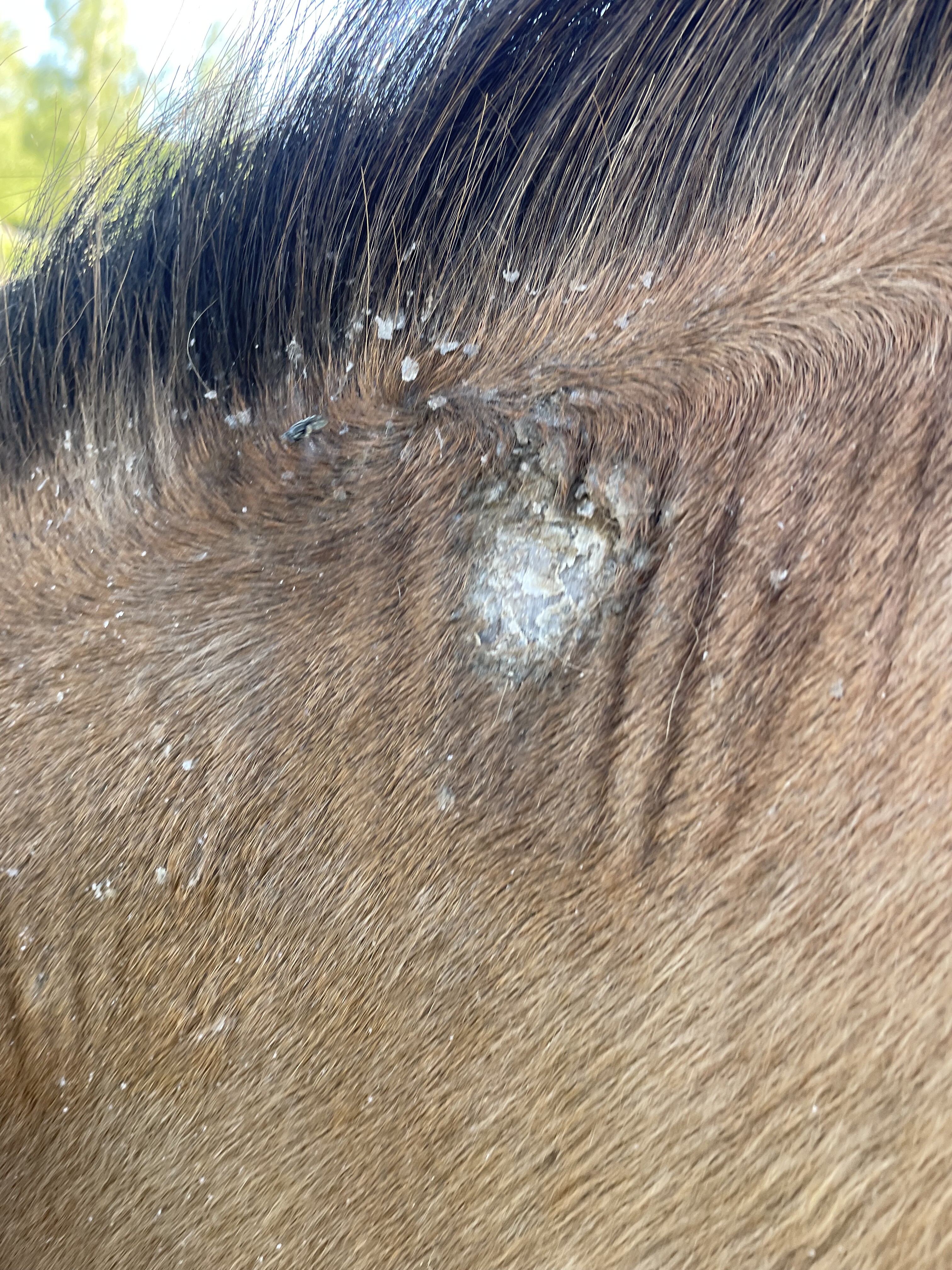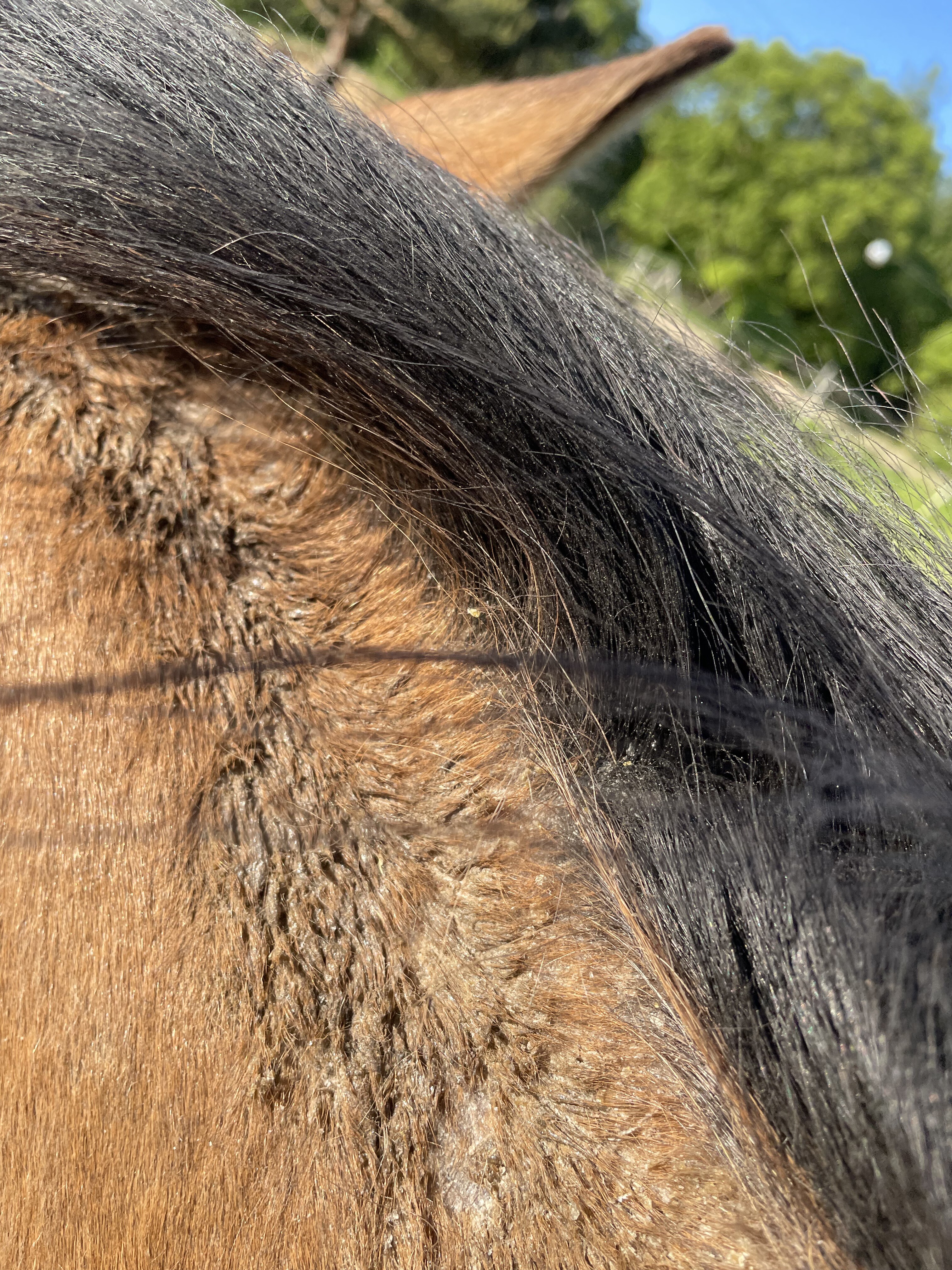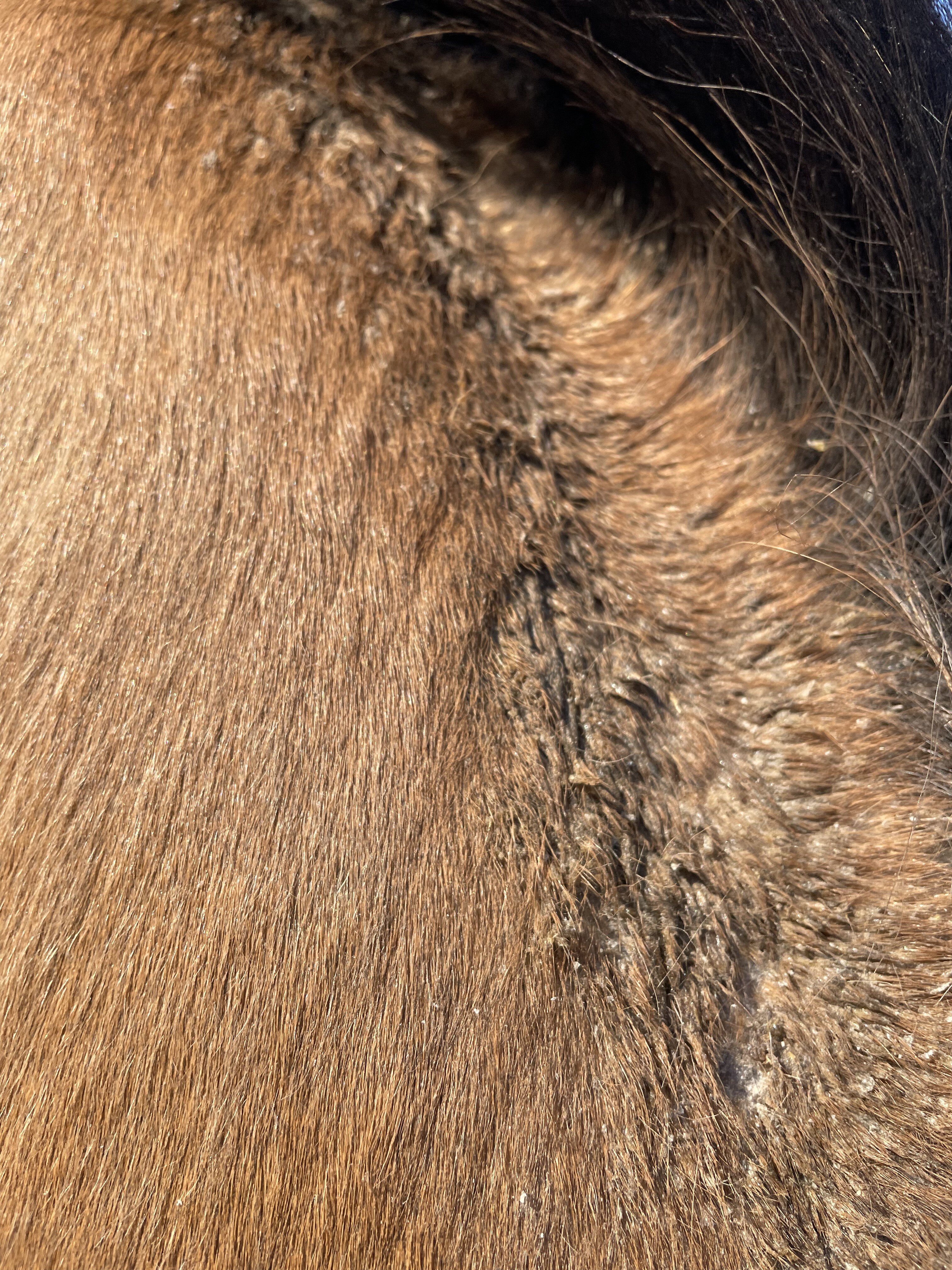 Od jakiegoś czasu walczyliśmy z grzybem, koń po dwóch dawkach szczepionki, wykąpany w szamponie z chlorheksydyną. Byliśmy na dobrej drodze, ale zobaczyłam, że ma jakiś łupież na grzywie, więc postanowiłam chłopaka potraktować mtg- małe ilości smarowane z ręki, na wieczór. Po dwóch dniach wyszło to co na zdjęciach. Paskudny sztywny łupież, aż taka skorupa… Czy ktoś się z tym spotkał po zastosowaniu mtg? Czekam na wizytę weterynarza, ale jestem ciekawa czy może Wasze konie miały coś podobnego i wcale to nie jest jakaś reakcja alergiczna na mtg.