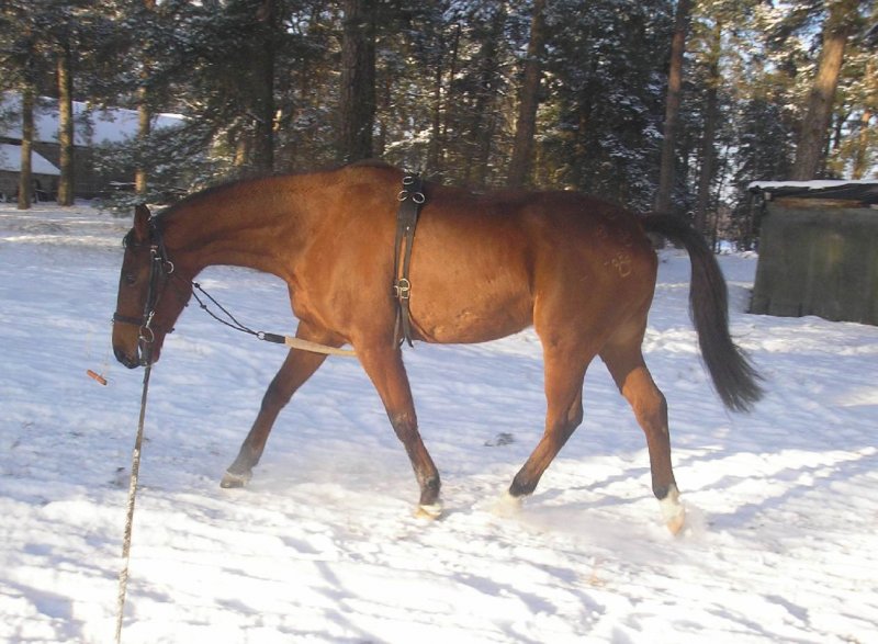Układał pod siodło moją Złotą Zorzę. Klacz po zajazdce- po powrocie do domu jezdzona odrazu przez ujezdzeniowca. Cóż.. masa pochwał, ze klacz rewelacyjnie reaguje na dosiad własnie. Nie pominę faktu, ze Złota NIGDY nie brykneła pod siodłem. Nie boi sie niczego w terenie i jako młody kon , po trzymiesięcznej przerwie / krycie/ wróciła w trening- równiez bez zadnych kłopotów. Teraz znów wyjechała, niedługo wróci- i wdrozymy ja w trening tez pewnie bez kłopotów.