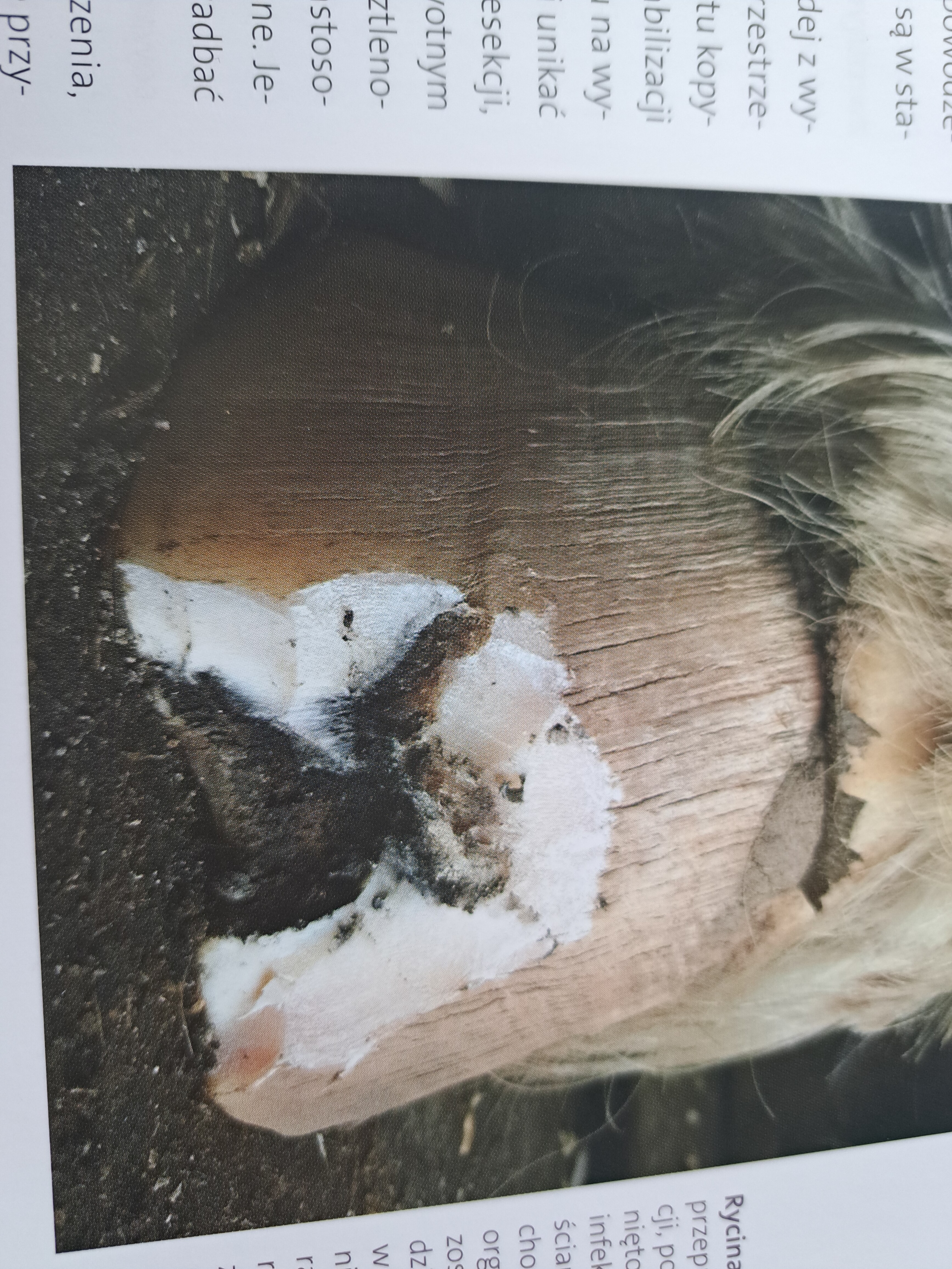 5. Moim zdaniem niestety te kopyta trzeba rozkuć bo w podkowach nie masz możliwości ich czyszczenia (robi się domki dla bakterii pod podkową) a wbijanie podkowiaków w taką zainfekowaną ścianę robi jeszcze głębsze tunele dla infekcji.