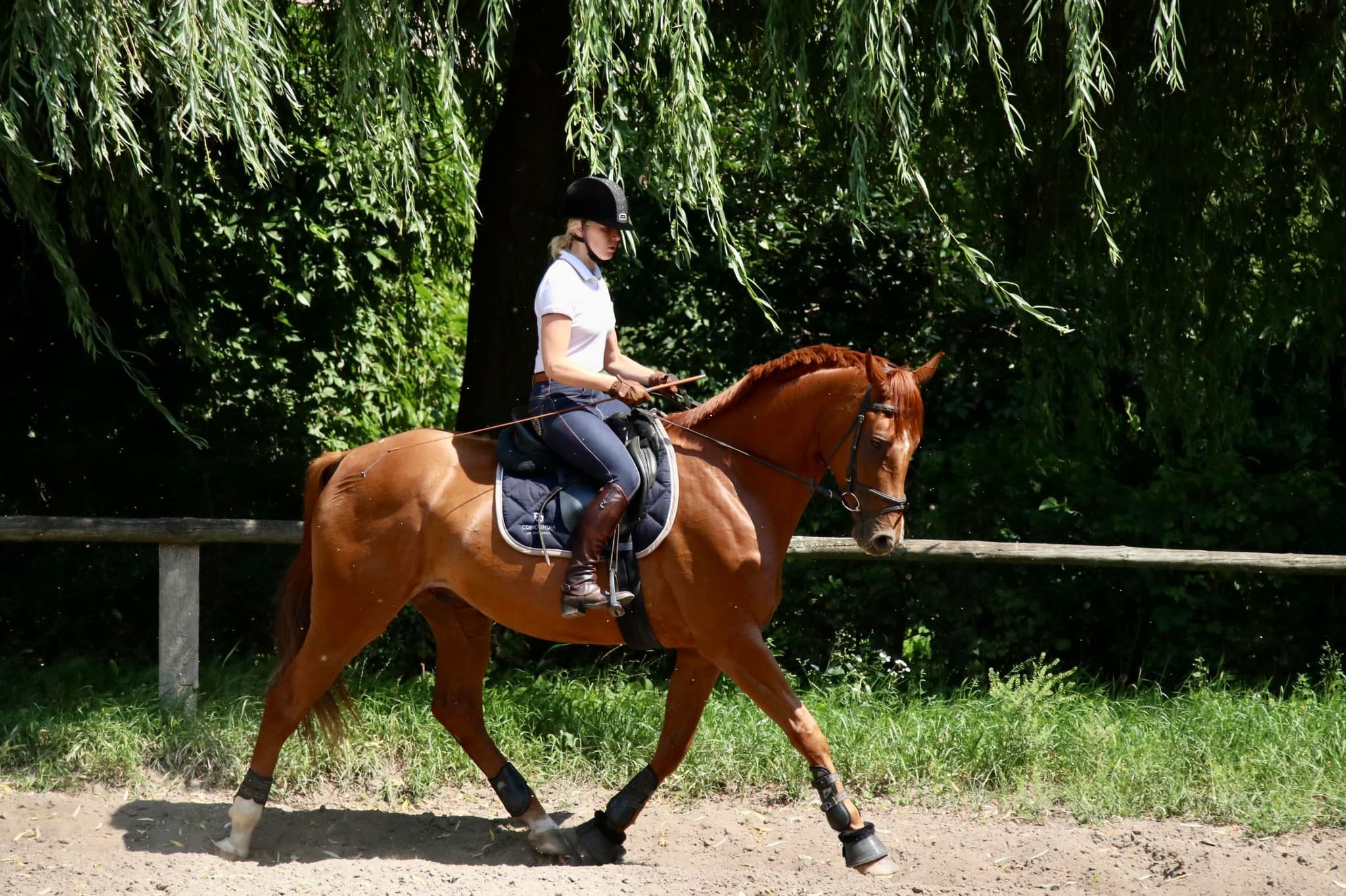 Wstawiam 4 latkę po Fürstenball. Kobyla w trakcie zajeżdżania, dopiero kilka razy jeżdzilam na niej na ujeżdżalni. Z charakteru bardzo miła, chociaż troche krowa i nie do końca mądra. Pod siodłem była nie do upchania. Dlugo trzebabyło z batem biegać za nią, żeby z jeźdźcem szła do przodu. Przy okazji zero reakcji na bacik, na łydkę ani nawet na ostrogę. Ogólnie mam już po jej rodzenstwie ktore było tak samo leniwe, sporo wiecej madrości i doświadczenia, wiec kobyle po prostu, taka pół surową, zaczeliśmy zabierać w teren.I to jej mega dobrze zrobiło, bo zrozumiała do czego są nogi i że można galopować. Nie mogę się jej doczekać, aż zacznie być bardziej "plastyczna" do jazdy, bo jej delikatność na kontakcie i okragłość w każdym chodzie, mega dobrze wróżą