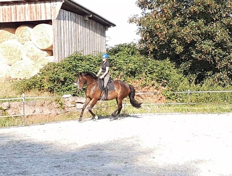 Macie fotki mojego ukochanego kuca 5 letniego. W sumie to z rodowodu Sir Donerhall x Rohdiamant i powinna byc wieksza, a ma moze z 150cm w klebie. Rodzinnie zryty beret ma. Tzn jest nerwowa masakrycznie i niecierpliwa, jak pozostale 2 siostry. Ekstremalnie elektryczna i chcaca przy kazdej okazji wyskoczyc spod tylka. Zeby nie bylo za latwo, to na dokladke mega delikatna na kontakcie, wiec jak wyskakuje spod tyłka , a przypadkiem przytrzyma sie ja mocniej, to juz kaplica, bo łeb na jedynke i dzida. W sumie jest już dosyc dlugo pod siodlem, ale w polowie zajezdzania ja wywalilam na padoki, a potem zajezdzalam od nowa w innej wersji. Mocno odciazalam jej grzbiet i zachęcałam do wydluzenia szji. Nadal zaangazowanie zadu to duzy problem Tak samo jak kontrola lopatki. Ale powoli jest coraz lepiej. Kucyk docelowo bedzie skakał , moze jakis cross. Ma z tego radość a jej starsza siostra po Quaterback tez skacze i to bardzo fajnie.