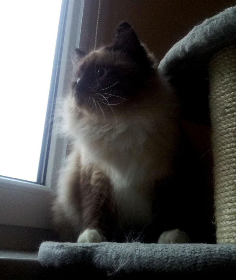 Mam problemy z kotami. Tzn swoją mam nadal tylko Mruczkę (Aslan jak przepadł przed Wigilią, tak nie wrócił). Mam tu zbiegowisko kocurów. Nie wiem czy nie ma na wsi innej kocicy??? Może jakby ona dała do siebie podjeść to by się powąchały i kocur by poszedł w swoją stronę? A ona tylko z mordą i pazurami i wrzask taki się robi, że lecę ( na boso nie raz i z mokrą głową) ratować koteczkę. A jak się w oknie tarasowym spotkają, to kocur patrzy tylko, a ta furia rzuca się po szybie... Kiedyś mi tu jakiś serenadę pod oknem śpiewał taką, że uszy trzeba było zatykać. Albo jest tak jak na zdjęciu (spokojna wersja z pomrukiwaniem tylko).