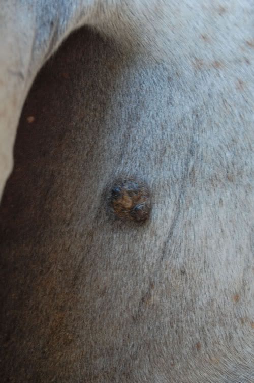 U mnie po ziółkach efekt był żaden :/ A miałam już do czynienia z dwoma sarkoidowymi końmi, u jednego - siwego - nagle wyrosły dwa sarkoidy, wypisz wymaluj jak te z pierwszej i drugiej fotki powyżej. Były w paskudnym miejscu, akurat tam, gdzie skóra tworzy sporo fałdek i rusza się i przesuwa przy każdym kroku... Jak zaczęłam to czymś smarować, to się zaczął cyrk :| Po pół roku smarowania różnymi wynalazkami łącznie z xxterrą, jak już guzy były mega wielkie i mega paskudne, to udało się je zlikwidować odpalaniem.