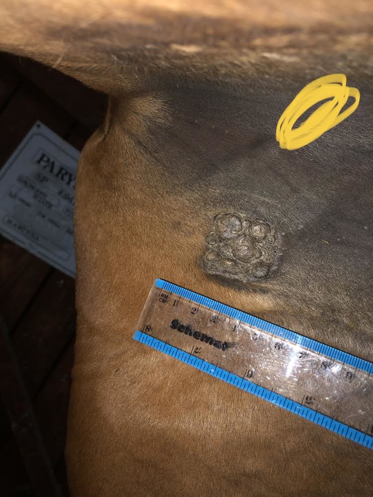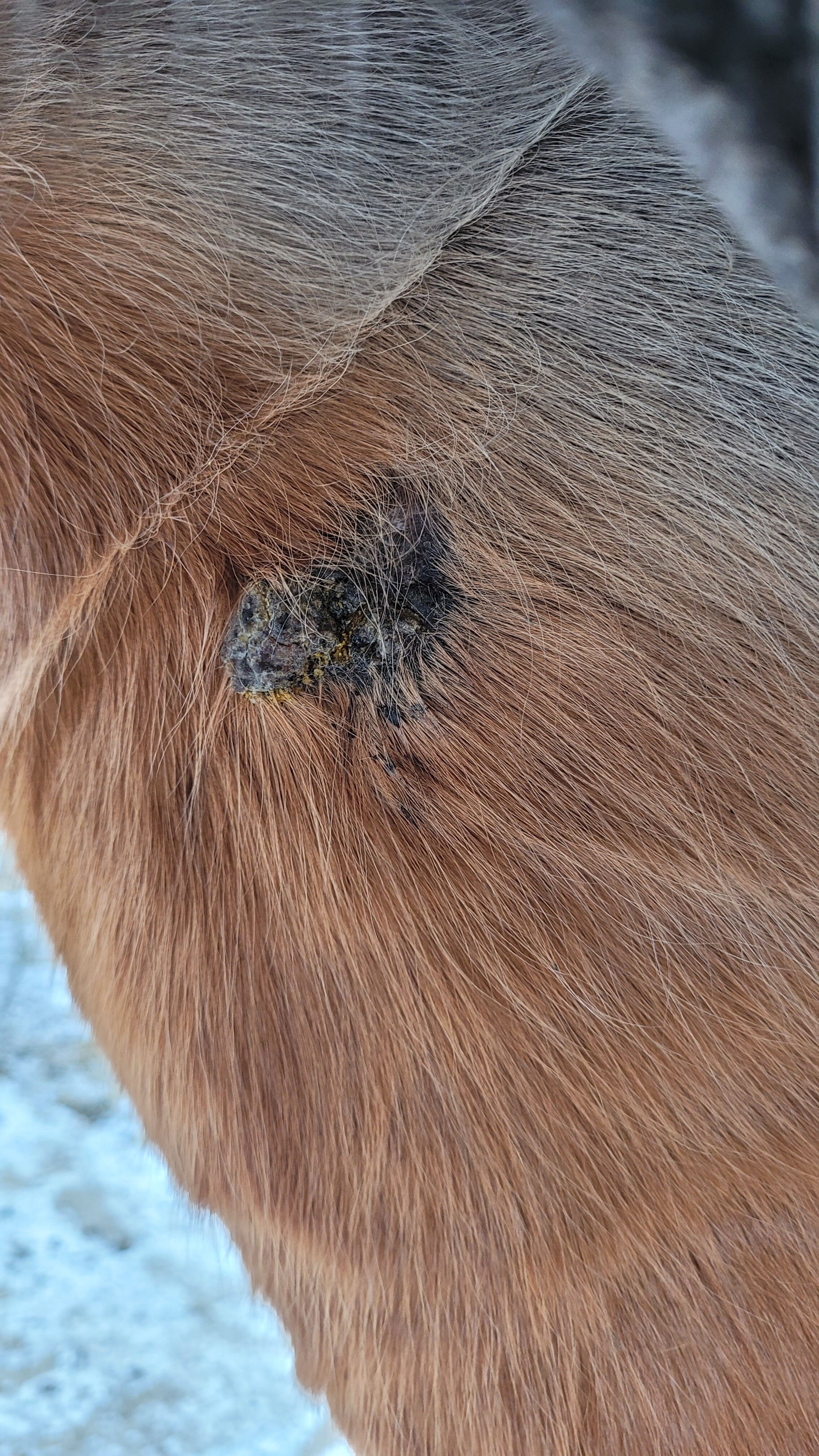 Dobre kilka lat temu klacz miała wielką ranę na klacie ( wet, szwy, było ryzyko że zostanie wielka blizna), koń wtedy młody załatał się ale został właśnie płaski strup, jako że mamy innego konia z sarkoidami to po wyglądzie uznaliśmy że to właśnie to.