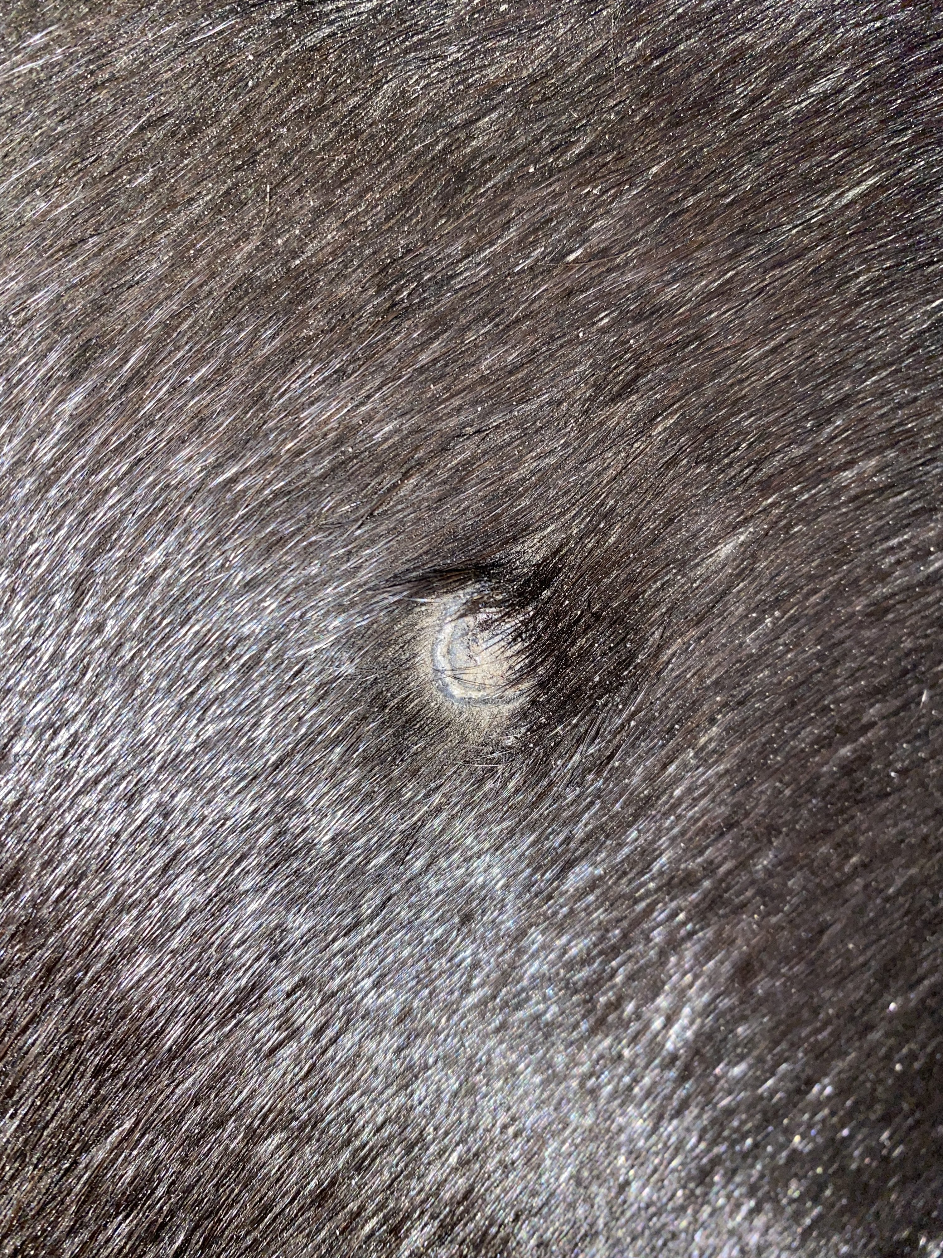 I teraz po ok 7 latach ten strup zaczął się zmniejszać, zarastać normalnie sierścią.
