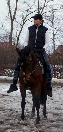 Po wyjeździe Bazia jeździłam kolejnego powyścigowego emeryta znajomej i mimochodem czasem przeglądałam oferty sprzedaży koni. Mimo wielkiej miłości do xx coś mi mówiło, że łatwiej i lepiej będzie mi kupić półkrewka. Dostałam cynk od zaprzyjaźnionego hodowcy xx, że ma na sprzedaż 3latniego ogierka, który słabo biega, ale dobrze się rusza i ma fajny charakter. Cena miała być przyjazna dla studentki. Już miałam się umawiać na wycieczkę na Służewiec, kiedy dostałam telefon: niestety twój niedoszły koń nie rozwinął się za bardzo od roczniaka, ma 158 w kłębie ( ja 174 wzrostu i nie kruszynka ), więc nie ma sensu, żebyś kupowała tego konusika. Pomyśłałam - racja, chociaż fajny był z niego zwierzaczek. W końcu trafił do Czech i miał próbować swoich sił w płotach. Po kilku dniach znajomy hodowca zadzwonił znowu. Mówił, że znalazł mi konia, ale ten kosztuje 3 razy więcej, niż miałam zapłacić za tamtego. Powiedziałam, że dziękuję mu za pomoc, ale nie mam ani tyle kasy, ani ciśnienia na kupowanie folgluta od jakiejś obcej osoby. Co innego od niego, bo jego konie znałam od źrebaków. Za godzinę kolejny telefon: cena konia zjechała do poziomu przyjaznego studentowi, ale ja nadal nie chciałam jechać go obejrzeć. Wtedy padły słowa, które mnie przekonały: to jest ogierek, więc jak się nie sprzeda, pojedzie do rzeźni. Następnego dnia o 4.30 siedziałam z kumpelą w pociągu do Wawy. Powiedziałam sobie, że go obejrzę, wsiądę i jak mi się cokolwiek nie spodoba, z czystym sumieniem go nie kupię. Jechałam tam tylko dlatego, że gdybym go nie obejrzała, nie dawałoby mi spokoju, że mógł rzeczywiście znaleźć się w rzeźni. Przyjechałam, wyprowadzili mi go przed stajnię. Usilnie szukałam w nim jakiejś wady, a tu cholipka nic! Wsiadłam w nadziei, że jest dla mnie za mały, niejezdny, albo cokolwiek. Niestety, wszystko było w porządku. No i nie miałam wyjścia, kupiłam go. Czekałam 3 tygodnie na koniowóz, żeby nie zrujnować się na transport trajlerem, więc prawie zapomniałam, jak wygląda. W końcu przyjechał. Jak go zobaczyłam, zakochałam się od drugiego wejrzenia. Jest ze mną od ponad 5 lat. Czasami go nienawidzę, ale nie żałuję, że go kupiłam, niezależnie od tego, czy ta wzmianka o rzeźni byłą prawdziwa, czy nie.
