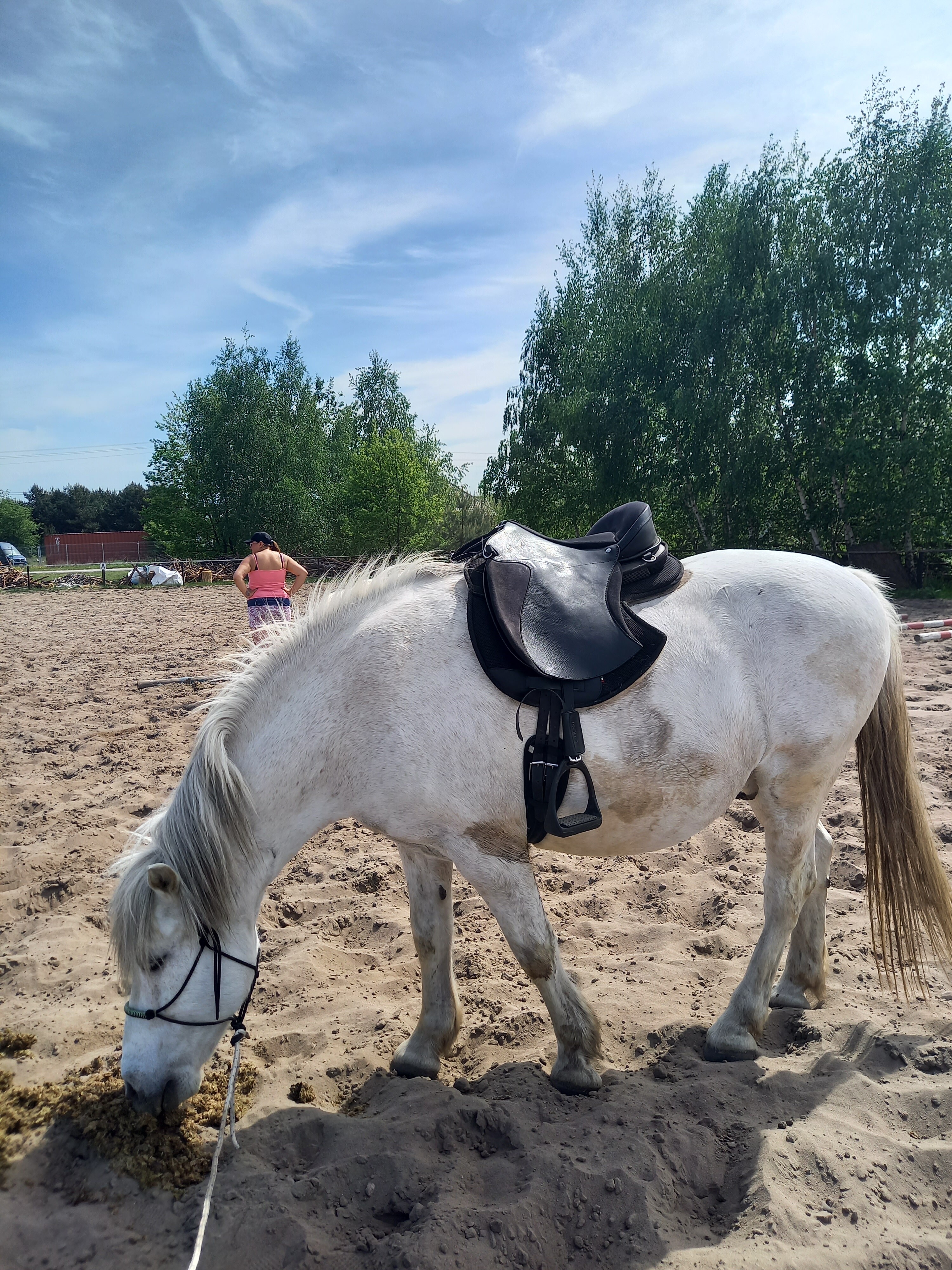 Mój je albo garść sieczki albo garść musli od mojego drugiego konia, pasza dla koni alergicznych i z ochwatem. Dostaje tylko dla smaku.