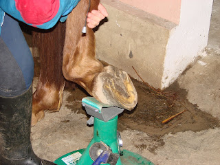 Prawy przód trzymam między nogami, bo inaczej kiepsko by było , a tak mi całkiem wygodnie , pozostale 3 kopyta trzymam sobie lewą ręka , dodatkowo kłade na kolanie , czasem sobie przykucne i nawet mi to idzie całkiem fajnie.
