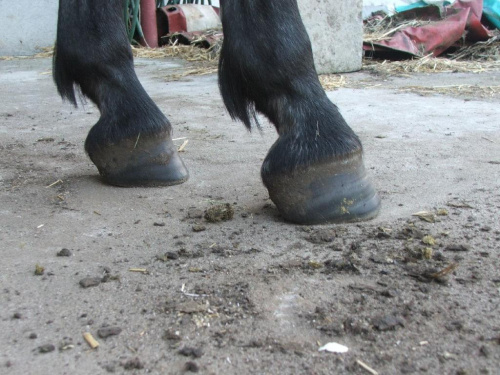 rzepka - a ktore z tych kopyt jest niby sztorcowe ? bo ja tam nic nie widze 🙂 ponizej przykład sztorcowych kopyt ( bo chyba nie wszyscy wiedza dokładnie co to znaczy ) według mnie na zdjeciu wstawionym przez ciebie koń ma po prostu za wysokie pietki ,raczej nie ma szans aby były tak naturalnie podwyższone wszystkie , ale oczywiście to mozna stwierdzić tylko przez ogledziny pod spodem ewent. zdjęcia RTG. gdyby kogoś zainteresowal przyklad kopyt przedstawionych przezemnie to odpowiadam że sa to kopyta naturalnie sztorcowe , potwierdzone zdjęciami RTG . oraz ponad roczną próbą ,,obniżenia ,, ich poprzez werkowanie naturalne , sztorc spowodowany prawdopodobnie urodzeniem się z przykurczami ścięgien zginacza głebokiego , a że klacz urodziła sie w SK . to nikt tam się zbytnio nie przykładał do prób ,,wyciagniecia,, jej z tego w wieku zrebiecym ( kupiłam ją jako 4 latkę ) zazwyczaj jedno z kopyt jest sztorcowe i jak Lars tłumaczył na kursie jest to spowodowane probą wyrownania jakiś braków w układzie kostnym wyżej ( jakoś kość jest krotsza np ) lub właśnie przykurczem ścięgna ... moja klacz jest bezproblemowo użytkowana wierzchowo , skacze parkur 80 cm , ale ze wzgledu na ,,inną,, amortyzację nie zamierzam jej probować wyżej ( jej samej nie przeszkadza brać ogrodzenie 140 cm , jak chce dostać się do stajni 🙂 ) patrząc na jej ruch z dalszej odległości nikt nie zauważyłby zadnych wad budowy