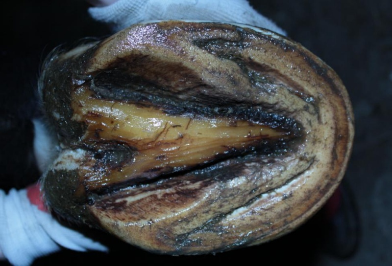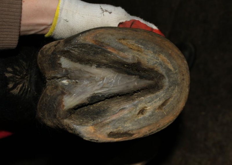 trzeba czekać aż można będzie dodłubać się do żywej podeszwy na całej długości tego wąskiego rowu który jest pomiędzy ścianą kopytową a podpórką wokół strzałki...głębokość tego rowu będzie nawet ponad 2cm...w tym samym czasie podpórka wokół strzałki powinna rozpaść sie na 2 części: osobno będą ściany wsporowe a osobno ta podpórka która bezpośrednio otacza grot strzałki (to co jest pomiędzy dwoma częściami podpórki, wykruszy się)