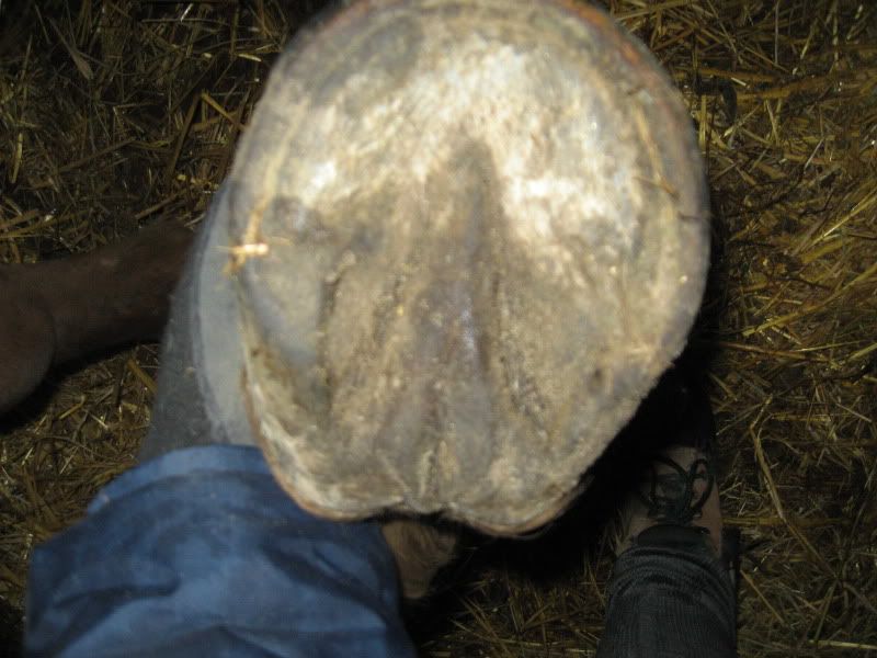 Wiwiana - jak widzę to kopyto, to aż mam ochotę spytać, czy to nasz kowal robił tego konia, grrr... kolosalne piętki, wyrżnięta bez namysłu strzalka, podeszwa wyraźnie nachylona do przodu i spiłowana na pazurze... Wszystkie moje konie tak wyglądały, zresztą patrz: Podobne, nie? 😉