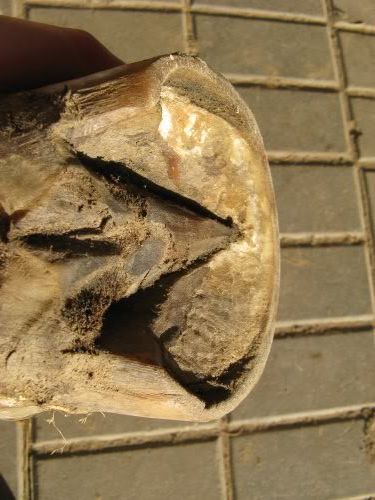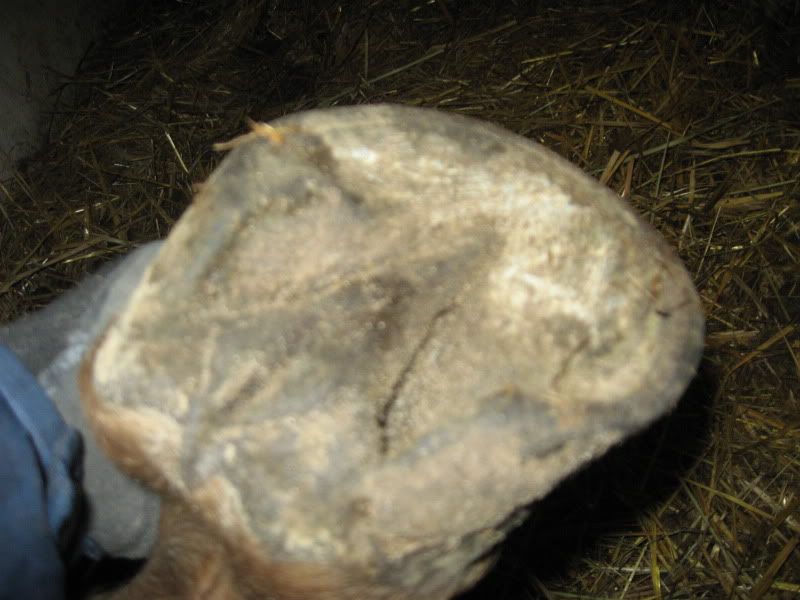 Strzałka wychlastana wisi trzy centymetry nad glebą (tyle dobrego, że nie gnije zbytnio), kąty wsporowe raszplą nie tknięte, przednia ściana płaska jak pod podkowę. A w każdym jednym kopycie lewy kąt wyższy od drugiego..... grrrr..... Na jakoś rogu narzekać nie mogę - starnikować brzeg podstawowy to masakra, muszę się szybko w cęgi zaopatrzyć, bo mi ręce poodpadają.