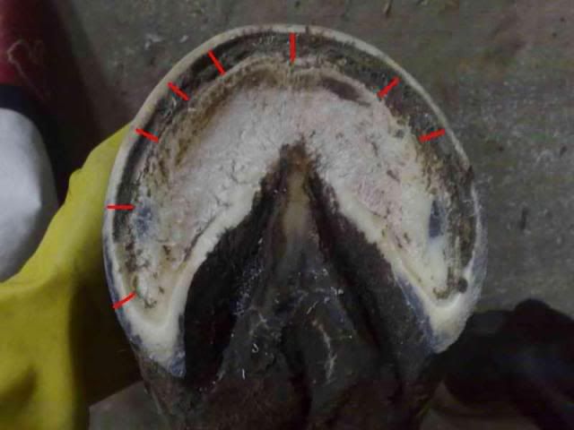 EDIT: Wydaje mi się czy robisz kopyto na równo? Tj. wysokość ściany. Wygląda jakby ściany przedkątne były za wysokie i dla tego nie widać z boku kopyta "łuczków". Ale może zdjęcia przekłamują.